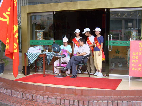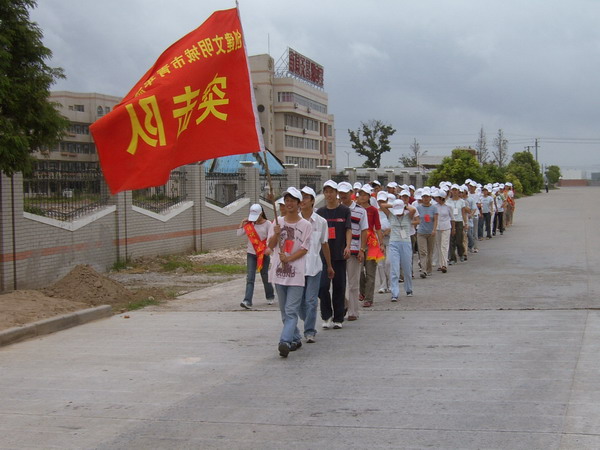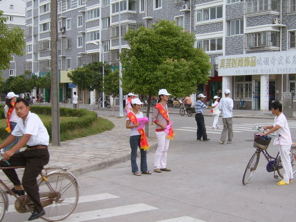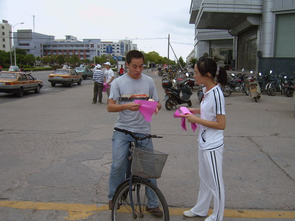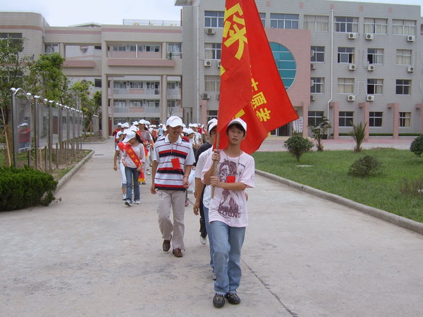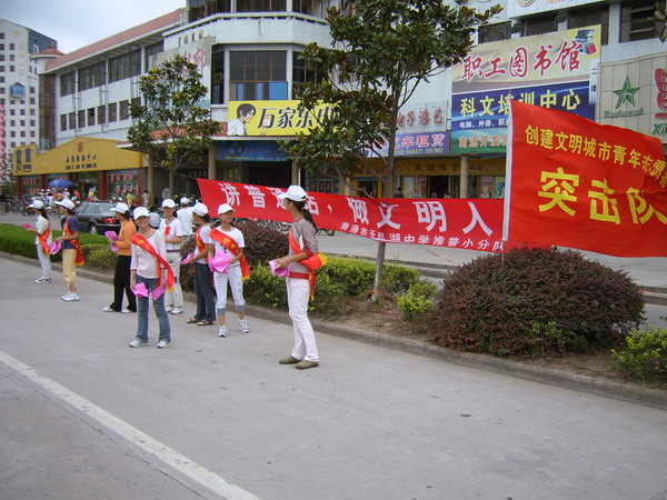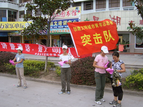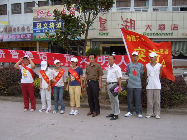 推普小分队整装出发,从学校出发前往活动的目的地—富阳超市,整个行进过程中,个个精神饱满,纪律严明,用实际表现展示着天中形象。 推普小分队的成员向行人发放传单,介绍并推广使用普通话: 唐进华书记和志愿者们在一起: 开发区教育科科长吴健、天星湖中学校长曹钤和志愿者们一起合影: |