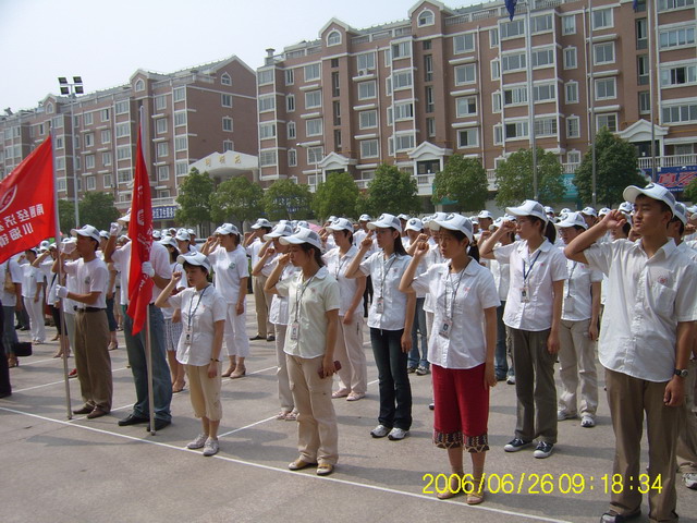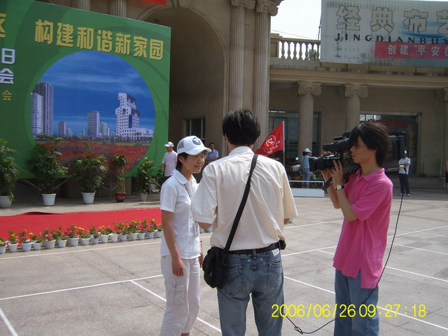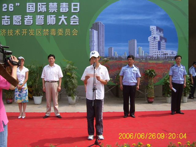 2006年6月26日,南通经济技术开发区禁毒志愿者誓师大会在爱玛花园南门广场隆重举行,我校60多名禁毒志愿者参与了此次活动,高二(3)班季龙同学代表全体禁毒志愿者发言,瞿丽华同学接受了南通电视台的采访,图片如下: |
