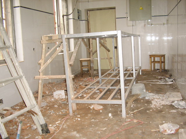 根据行业标准,原定暑假期间进行全面改造的计划因创卫要求现提前实施,图为施工现场。