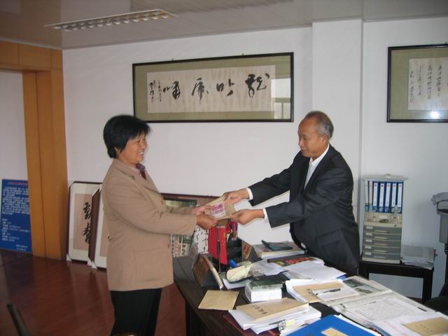 在学校2007年高考又创新佳绩的大好形势下,我校高三三位优秀毕业生王白茹,顾磊,蒋星晨喜获"希望工程圆梦大学"电力助学金,资助标准为4000/人。图为学生家长代表从学校曹校长手中接过助学金。