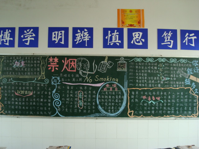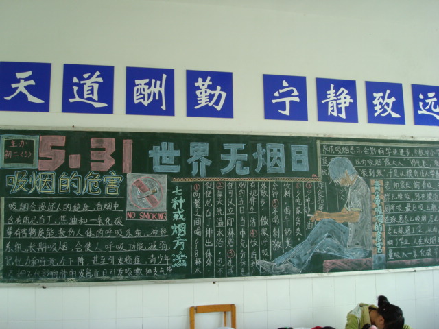 为了认真贯彻南通市2008年创建全国文明城市工作中有关控烟、禁烟文件精神,进一步提高社会对吸烟有害健康的认识,增强同学们的控烟、禁烟意识,同时为了迎接5月31日的第21个世界无烟日,学校政教处、团委、学生会特联合举行以“无烟青少年”为主题的黑板报评比,结果如下: