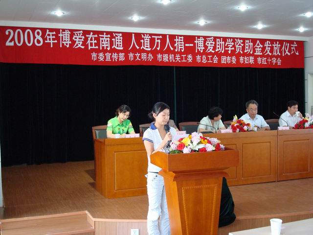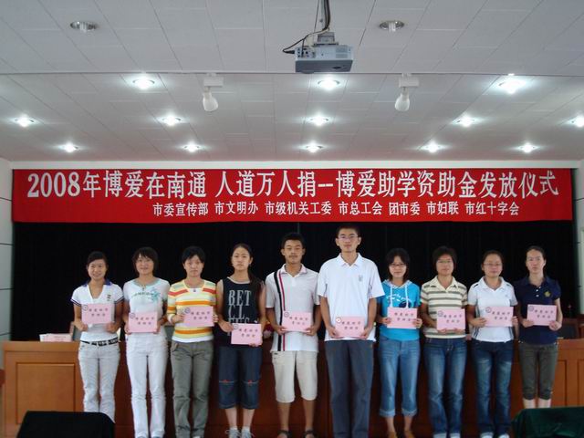 由南通团市委、市红十字会联合市委宣传部、市文明办等7个部门发起的博爱在南通、人道万人捐——博爱助学金发放仪式于2008年8月26日在市卫生局会议室举行。 我校韩平、袁新海等十位同学获得每人2000元资助金。其中陈小利同学作为学生代表作了表态发言,并接受了南通电视台城市日历节目的采访。 受助学生名单:徐佳佳、黄慧、马娟、张湘湘 袁新海、陈果、顾涵、陈辉辉、韩平、陈小利 |