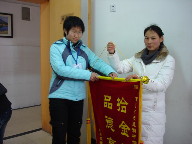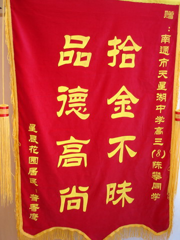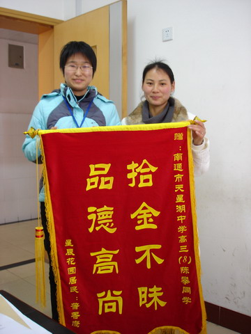 2月16日上午,天星湖中学的校园里来了一位年轻的彝族妇女,她要将一面写有“拾金不昧 品德高尚”的锦旗送给一位叫陈攀的女同学,表达她的诚挚感谢。