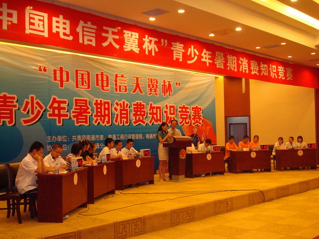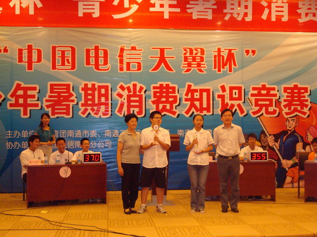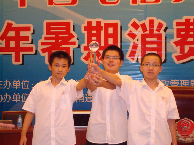 8月13日,我校三名学生代表开发区参加了南通市2009年度“中国电信天翼杯”暑期青少年消费知识竞赛。在上午进行的笔试预赛中,我校学生出色发挥,周一同学100分,石昆同学98分,王冀源同学95分,以总分293分的成绩在来自全市五县四区的9支代表队中列第五顺利进入决赛。下午的决赛在南通市工商局三楼的大会议室进行,来自开发区、如东、海门、港闸区、如皋、崇川区的六支代表队展开了激烈角逐,我校学生顶住压力,沉着应战,经过闪亮登场、同心协力、分秒必争、当机立断、风险提速等5个环节的比拼,最终以团体总分第三的好成绩捧回了 “中国电信天翼杯”暑期青少年消费知识竞赛二等奖的奖杯。