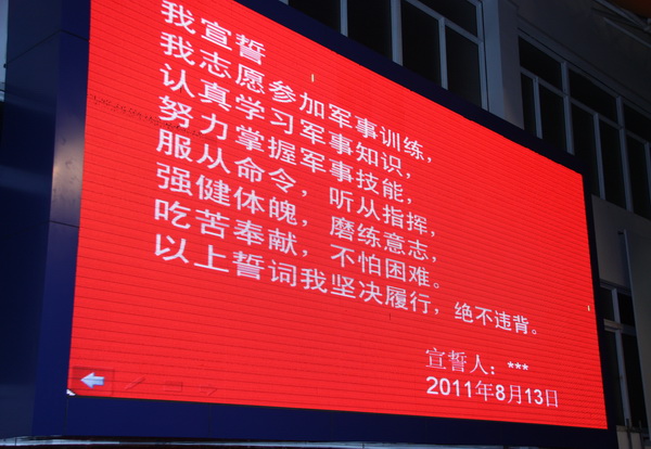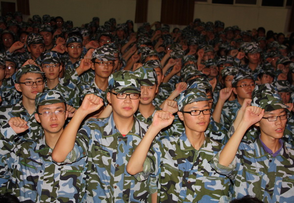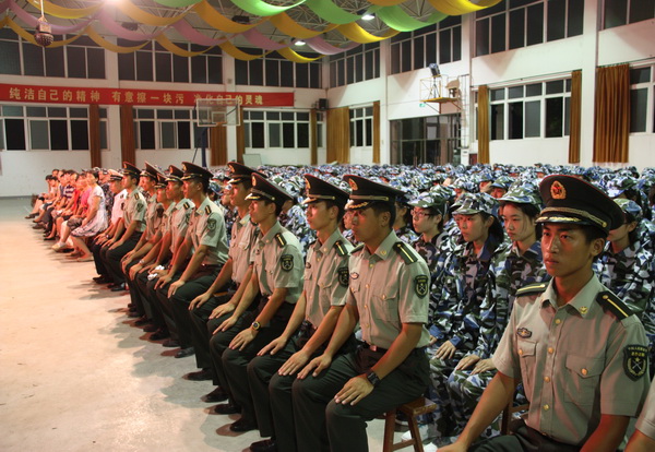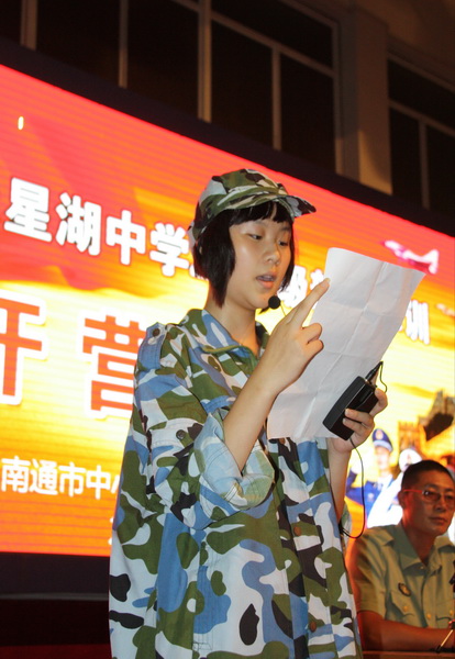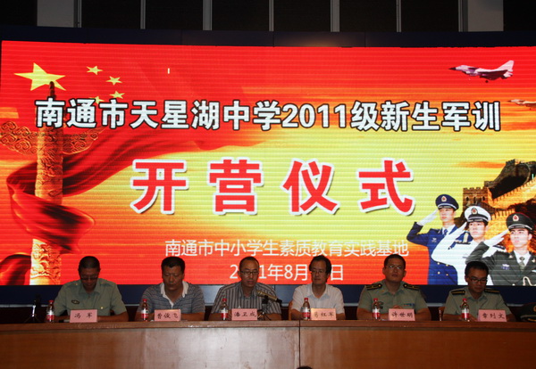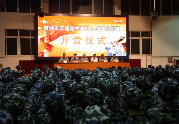 从踏入军训营地开始,一切都是军事化管理,原来学校的班级编排此时已由中队称号代替。由于本阶段有两所学校同时接受军训,所以我校原先的1—12班分别被称为16—27中队。 13日晚饭过后,同学们就换上了由军训基地统一提供的军人迷彩服,接着参加了基地的安全教育。 晚十点正,南通市天星湖中学高一新生军训开营仪式正式开始。身着草绿色军装、置身草绿色方队、目睹英姿勃发的教官、耳听铿锵有力的口令,同学们的心灵在一种全然未曾体验过的神圣的氛围中经受洗礼。 开营仪式上,我校葛红军校长助理以及基地领导、教官代表分别讲话,他们勉励同学们经受磨练,锻造意志,提高素质。学生代表也作了激情洋溢的发言。最后全体参训学生进行了庄严的宣誓。 据了解,本次军训教官来自解放军理工大学(号称军中的清华、北大),多为大三生,他们不仅素质一流,而且体格健壮、相貌堂堂。相信教官们的调教会让那些父母无微不至呵护下的文弱书生们变成铮铮硬汉、飒爽女子。