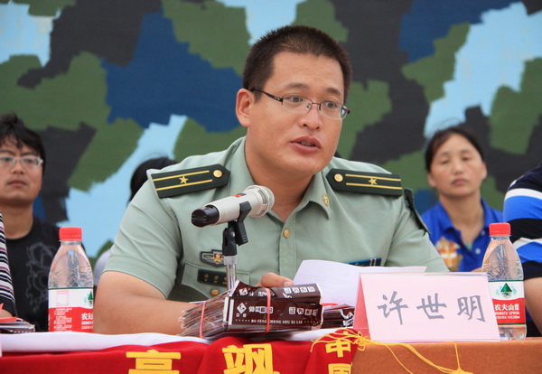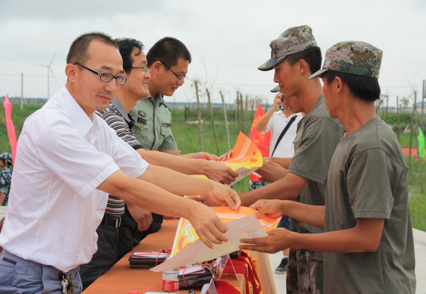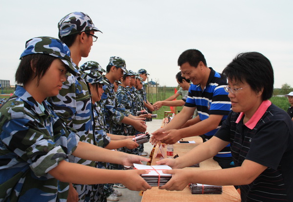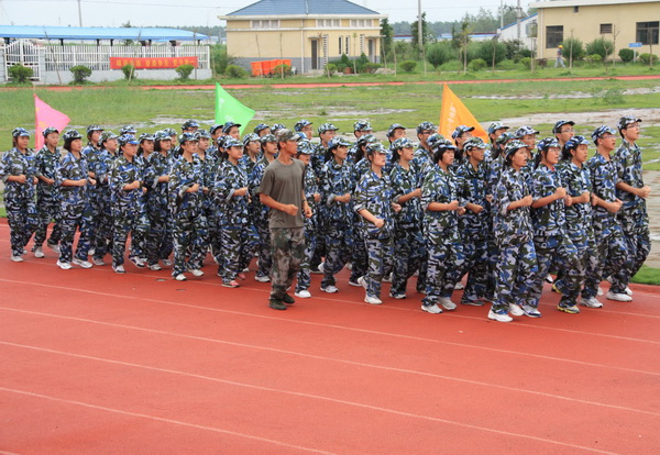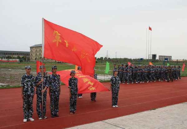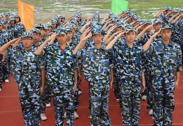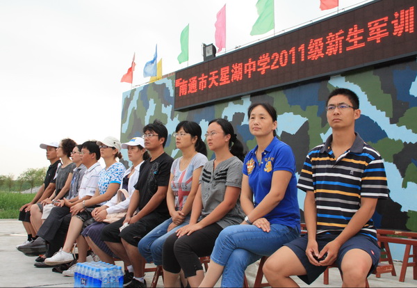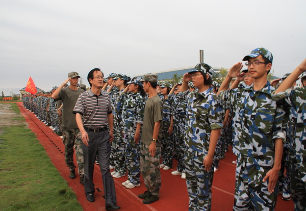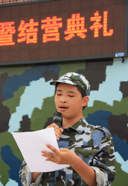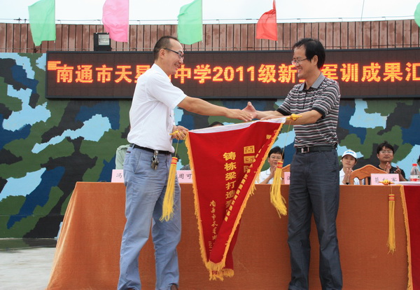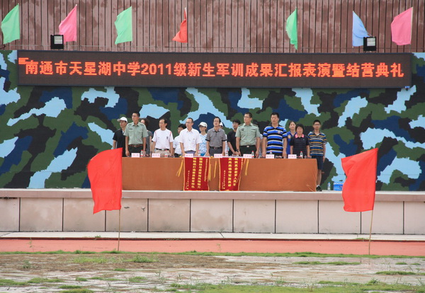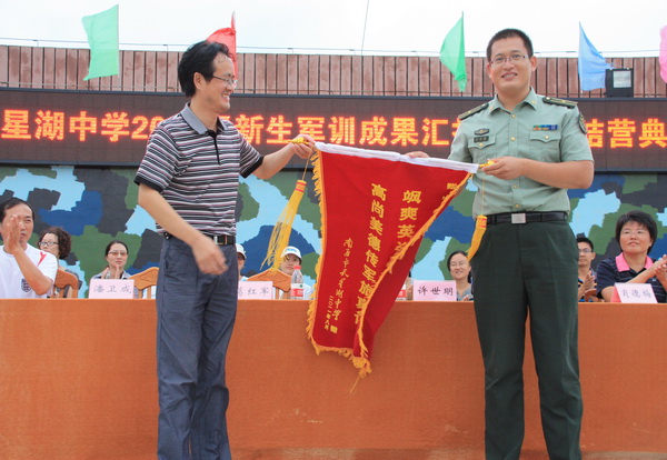 在庄严的升国旗仪式之后,全体参训的高一新生又以注目礼的形式迎接军训大队队旗和天星湖中学校旗入场;接着,天星湖中学校长助理葛红军同志在军训大队长的陪同下,检阅了高一新生参训方阵;然后,各中队在教官的指挥下,以严正的军姿、威武的气势、整齐的步伐跑步通过主席台,此刻只听到动地的脚步声和冲天的口号声,凝聚着同学们五天心血和汗水的军训成果在这时得到了充分的展示,主席台上的领导 结营仪式上,葛红军校长助理发表了言辞恳切的讲话,他对几天来教官们的辛勤付出表示感谢,对同学们取得的成绩表示祝贺,对班主任的敬业精神表示赞许,并希望同学们将训练中培养形成的精神品德在今后的学习中加以发扬。学生代表张钧同学也在发言中感谢教官,感谢班主任,并表示一定不辜负教官的鼓励,好好学习,早日成才。军训大队长许世明通报表扬了本次军训中取得优异成绩的中队和同学,发给了奖状和证书。最后,葛红军校长助理代表学校向军训基地和担负军训任务的解放军理工大学赠送了锦旗。