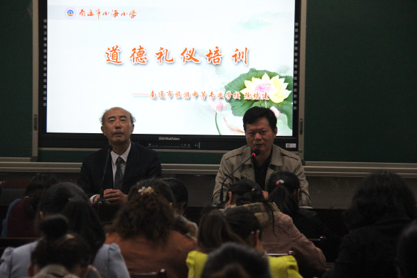 为提高我校教师的素质和内在修养,规范教师的仪容、仪表和待人接物的行为语言,5月9日,小海小学邀请了南通市旅游中等专科学校的徐培建老师来校做道德礼仪培训。