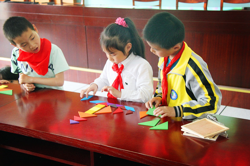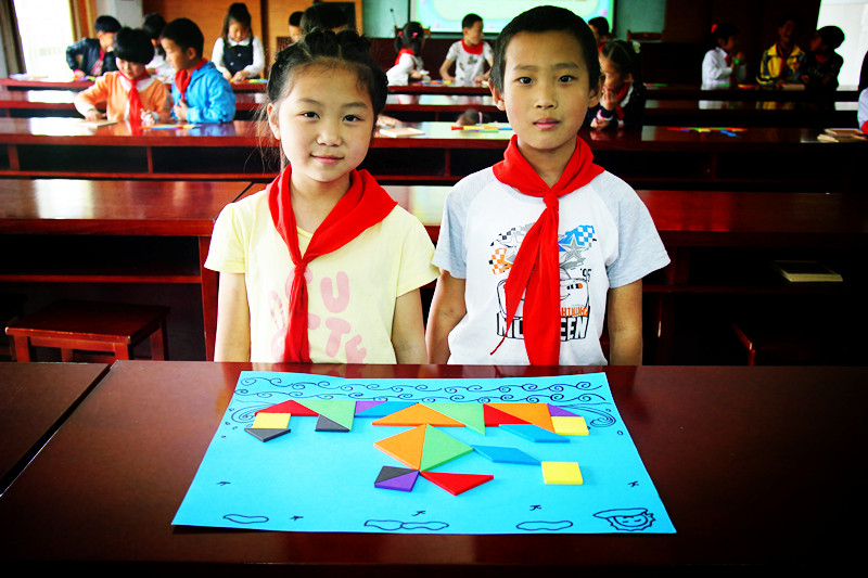比赛中,一年级的孩子们两人一组合作进行,他们灵巧自如地翻转着不同形状的拼图板,东一拼,西一补,发挥自己的想象力和创造力。不一会儿,轮船、汽车、飞机、火车等图案便跃然出现。那一幅幅妙趣横生的造型,一个个灵巧的构思,一份份新颖的创意,充分展现了同学们的智慧与才干。