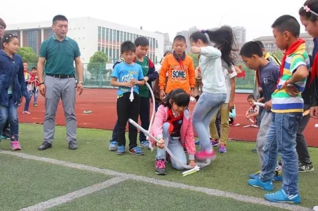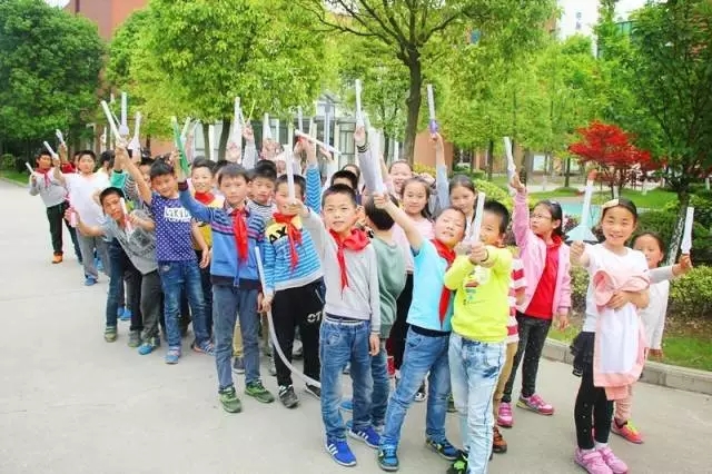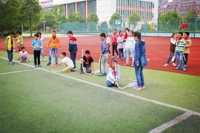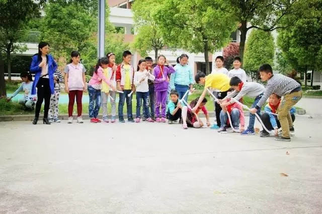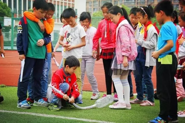 为在比赛中取得好成绩,同学们在利用课余时间查阅资料,自制“气动火箭”:一个饮料瓶、一根PVC管、一支自制纸火箭,简单地组装后,一组“气动火箭”就能“升空”了。为了能让火箭飞得更高更远,孩子们又不断试验、调试、修正——使用更大的饮料瓶、选择合适的发射角度、给火箭增加螺旋尾翼……各班在赛前进行了班级竞赛,经过激烈比拼,班级的优胜者得以出线参加校级比赛。