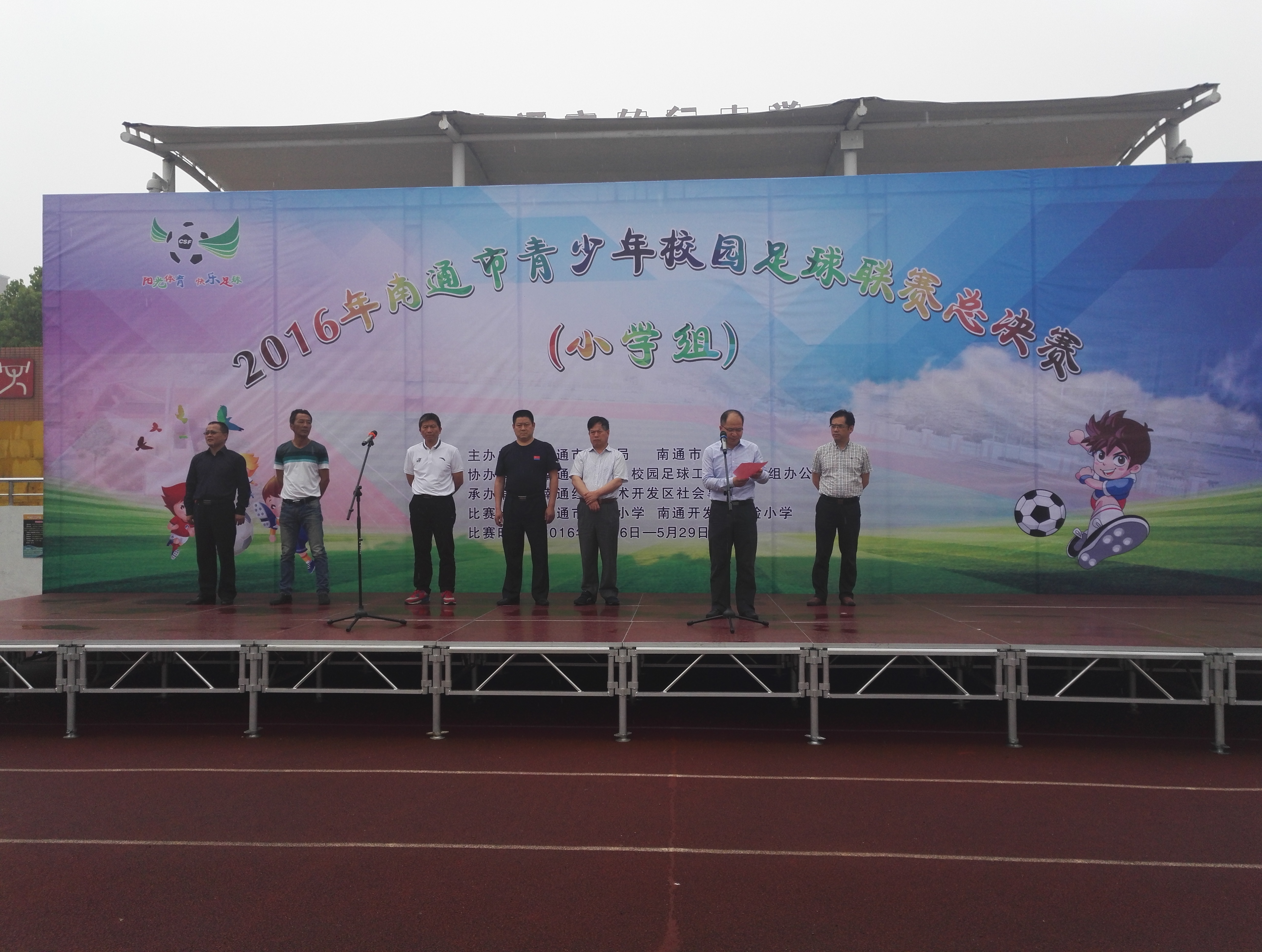 5月26日下午,2016年南通市青少年校园足球联赛总决赛(小学组)开幕式在南通市竹行小学举行,开发区社会事业局局长邵平致辞,市体育局副局长姜海泉讲话,市教育局局长助理樊建清宣布比赛开幕,开幕式由市教育局体卫艺处处长朱宁主持。