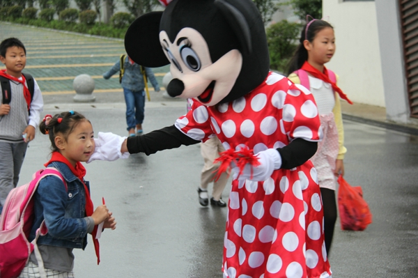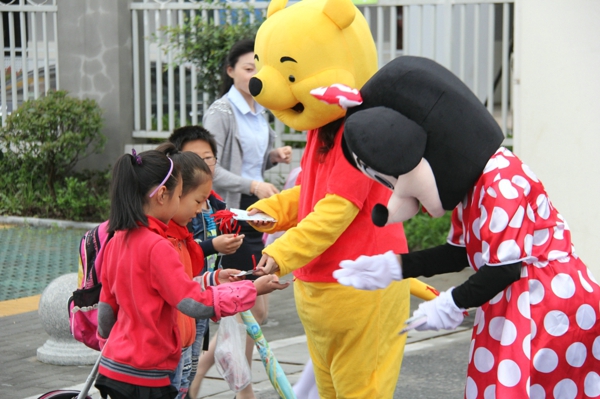 清晨,刚到校的附小学子们就被校门口可爱靓丽的卡通人物所吸引,美丽优雅的白雪公主,帅气逼人的王子,活泼可爱的米奇米妮向每一位进校的孩子发放小书签。一张张老师精心绘制的书签寄托着愿孩子与书为友的心愿,孩子们爱不释手,迫不及待地夹入书本。