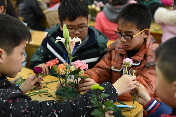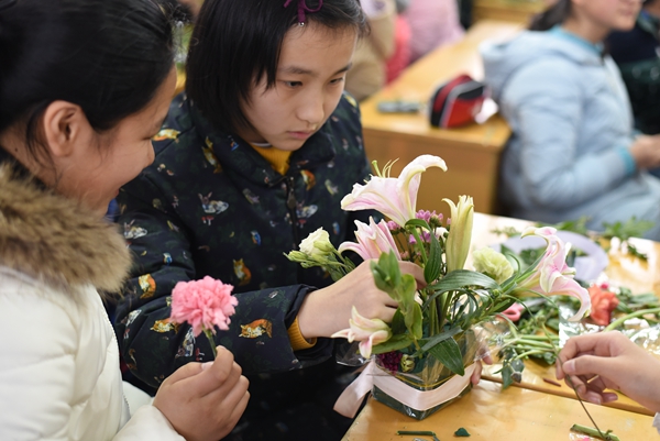 中午午休时间,学校手工社团指导老师,为同学们讲述了插花的原理,插花中要注意黄金分割比例、色彩、主次关系、质感、韵律、平衡......还有花的护理方法,之后同学们自主选择花材,利用小组合作完成了各自心中最美的作品。“这是我三八节收到的最好的礼物”收到鲜花的宋老师开心地说。
