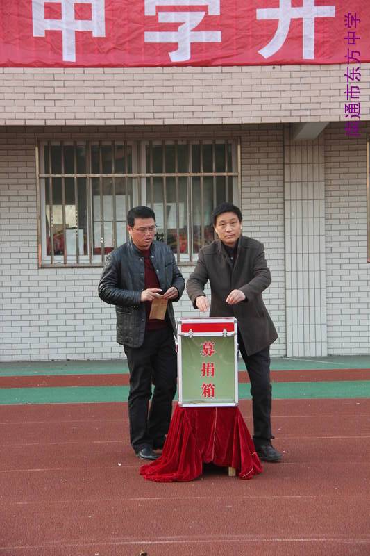 2016年2月25日下午南通市东方中学全体师生在操场举行了“向沈煜同学献爱心”的募捐仪式 ,在柔和的春风中传递着温情。全校各班共募集金额88080.5元,另外学校先后从校爱心基金和教师一日捐中拿出9350元,总数合计97430.5元全部捐给沈煜同学。我们有理由相信,我们的爱心可以照亮整个世界,我们的爱心可以温暖沈煜一家疲倦的心灵,帮助沈煜一家度过难关。愿我们的点滴付出凝聚成爱心的彩虹,让黯淡的生命重新焕发出灿烂的生机!衷心祝愿沈煜同学早日康复!重新回到他所深爱的老师同学之中!