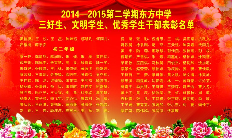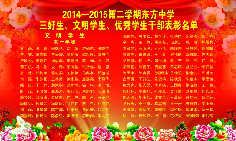 蒋子平副校长宣读了关于上学期各班三好学生、文明学生和优秀学生、学校文明班级的表彰,并为上学期的文明班集体颁发了奖状。最后羌松延校长发表了热情洋溢的讲话,首先他对新加入集体的老师和同学表示了热烈的欢迎,同时希望同学们从小事做起,养成良好的文明行为习惯,并鼓励全体师生努力拼搏,争取再创东方中学新的辉煌。羌校长的以妙趣横生故事和深入浅出的哲语赢得了全体师生的热烈掌声。