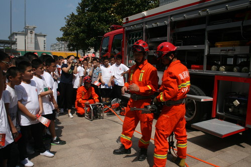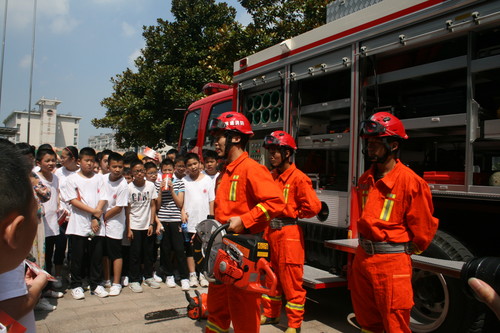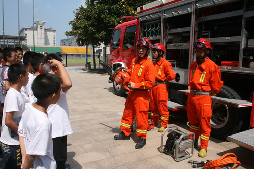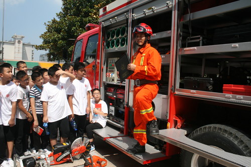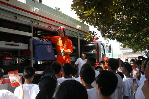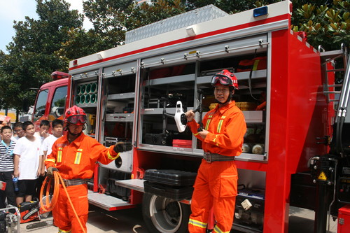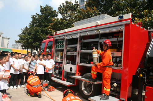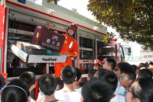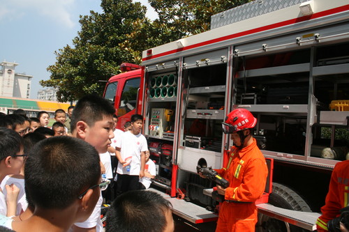 演练结束后,为进一步提高学生对消防安全器材的认知度,消防官兵带领学生参观了消防车,通过消防员的精彩讲解,使学生零距离感受到各种消防器材的实用性。