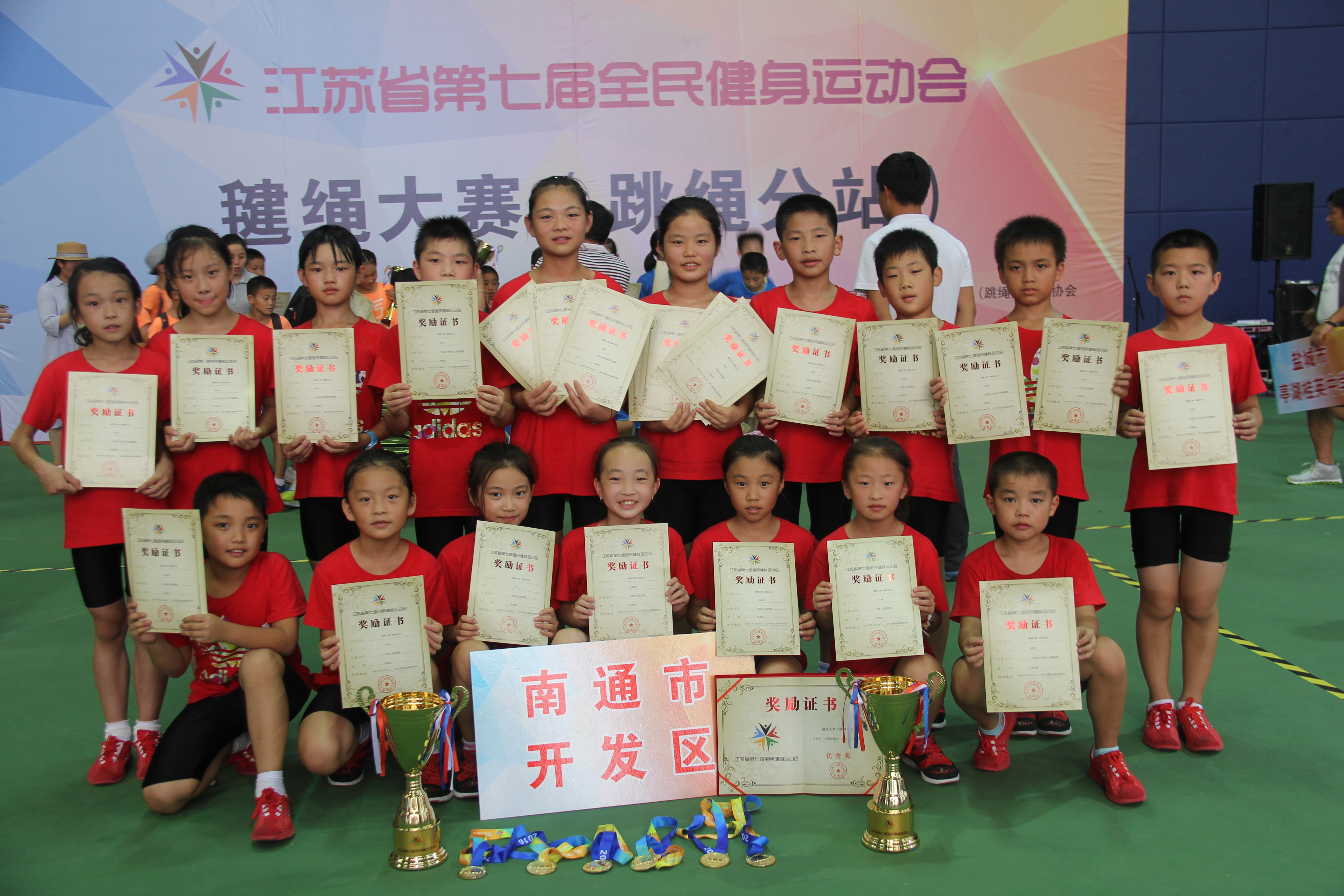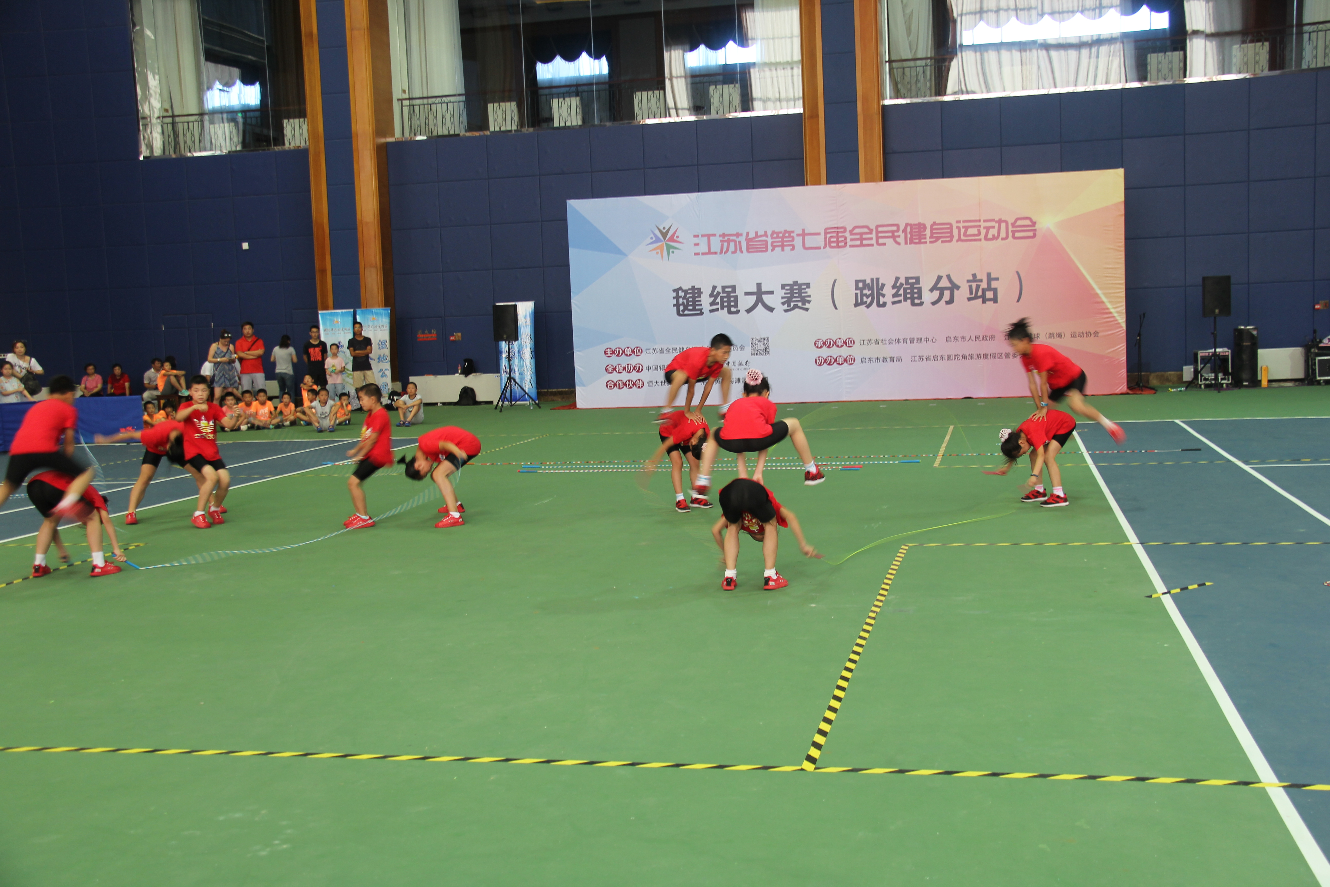 8月23日—26日,江苏省第七届全民健身运动会毽绳大赛(跳绳分站)在启东圆陀角旅游度假区举行。南通开发区花样跳绳队和来自全省各地的15个代表团,共计220余名运动员参与本次比赛,角逐花样跳绳、男女单双摇、交互绳、团体项目等一系列赛事。