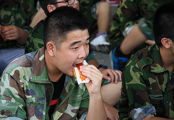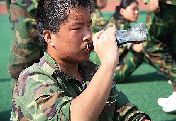 “嘟、嘟、嘟”,随着指挥员一阵急促的哨子声,训练间隙的休息开始了。此刻同学们首选的便是去拿上自己的水壶、水杯,“咕嘟嘟”直往肚里灌水,训练基地统一发放的平时可能并不喜欢的小点心也成了此时嘴里的美味佳肴。