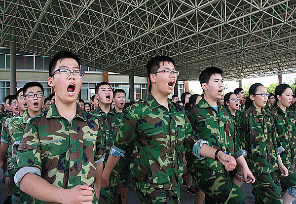 火辣辣的太阳挂在空中,湿漉漉的汗水浸透衣背,口令声、口号声此起彼伏,正步走、齐步走坚定有力。
