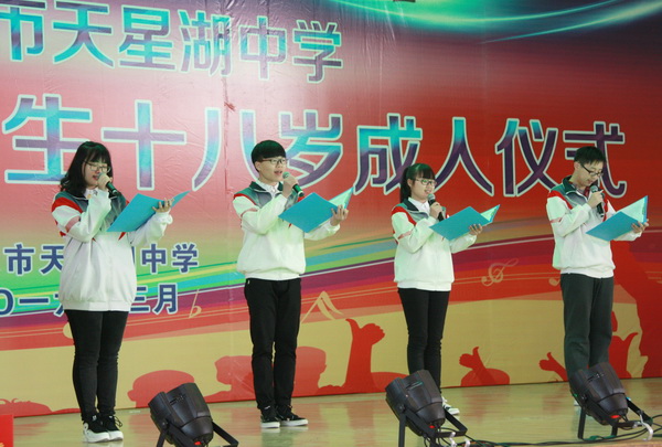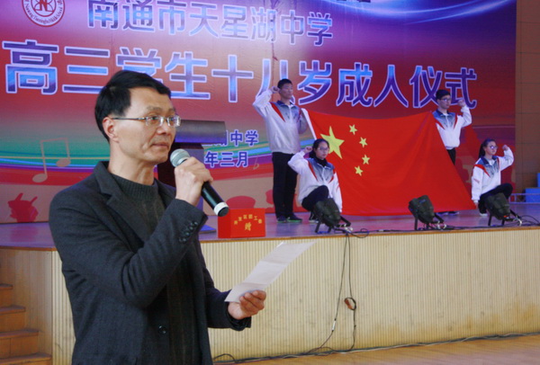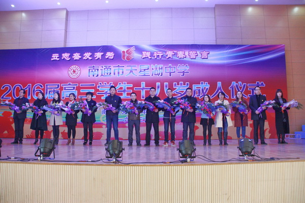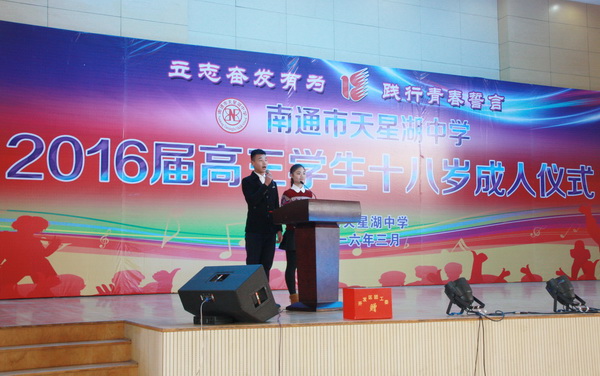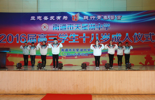 3月6日下午,在校团委和心理辅导中心的组织下,学校风雨操场布置一新,我校高三年级的学生和家长、老师济济一堂,一起参与了南通市天星湖中学“立志奋发有为践行青春誓言”2016届高三学生成人仪式。