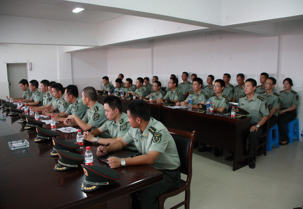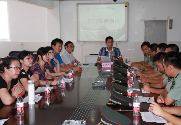 几乎与此同时,由学校领导、班主任和基地领导、教官共同参加的军训联席会议也正在基地会议室召开。在对各中队的中队长(即教官)和指导员(即班主任)逐一作了介绍后,负责本次军训的来自南京解放军理工大学的杨志大队长和天星湖中学陈卫东主任分别表态,决心相互配合、科学管理、严格要求,保质保量地完成天星湖中学2013级高一新生的军训任务。