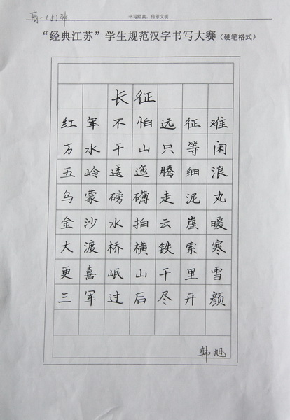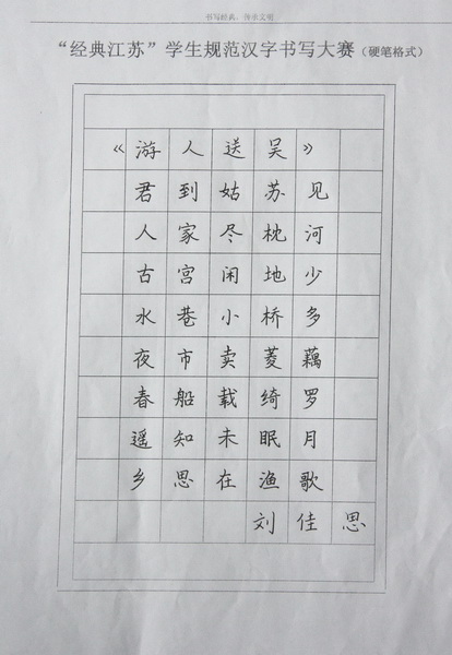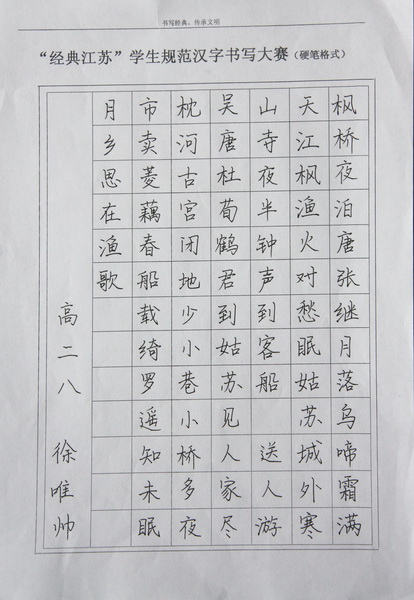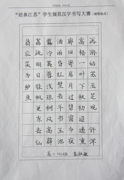 为深入贯彻落实党的十八大关于“建设优秀传统文化传承体系,弘扬中华优秀传统文化,大力推广和规范使用国家通用语言文字”等精神,配合南通市“共筑中国梦”中华经典诵、写、讲系列活动的开展,“经典江苏”南通市天星湖中学2013学生规范汉字书写比赛于5月下旬顺利举行,全校共有200多位学生参赛,经过评审组认真评比,各奖项如下: