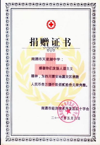 一向有着扶贫济困、解囊相助传统的天星湖中学人再一次向深受地震灾害的人民伸出了援助之手。5月6日,承载着天星湖中学爱心的38000余元善款交由了南通经济技术开发区红十字会,以此为四川雅安地区抗震救灾尽一份绵薄之力。