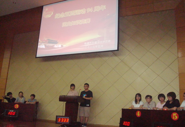 决赛共设四个环节:个人必答、小组必答、抢答和风险问答,场上的选手比拼的是对团史的熟练掌握程度和临场应变能力,场下各参赛队的拉拉队比拼的是口号的响亮程度。主持人与场下观众互动有奖问答将现场的气氛推向高潮。