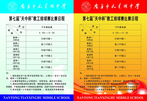 天星湖中学第七届“天中杯”教工排球赛于2013年4月8日——4月16日在学校运动场举行,共有三个年级组和行政组四个代表队参与了比赛。经过激烈角逐,最终行政组以三战全胜的成绩获得第一名,高一、高三和高二年级组分列二、三、四名。