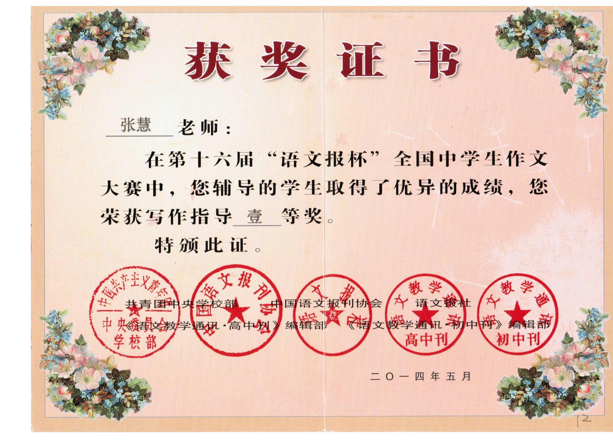 张慧老师在全国第十六届“语文报杯”学生作文竞赛中获一等奖(指导奖)