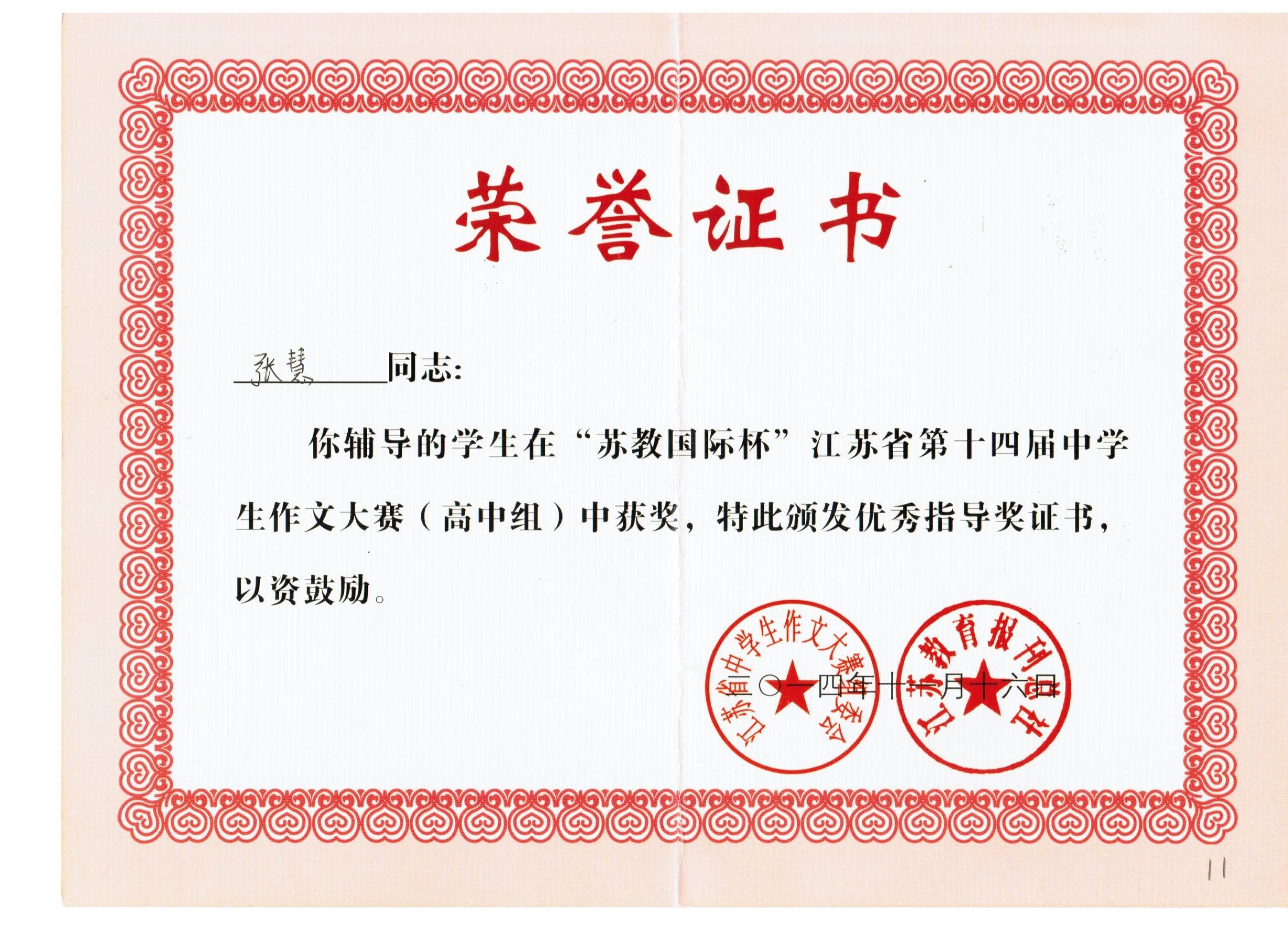 张慧老师在“苏教国际杯”江苏省第十四届中学生作文竞赛中荣获优秀指导奖