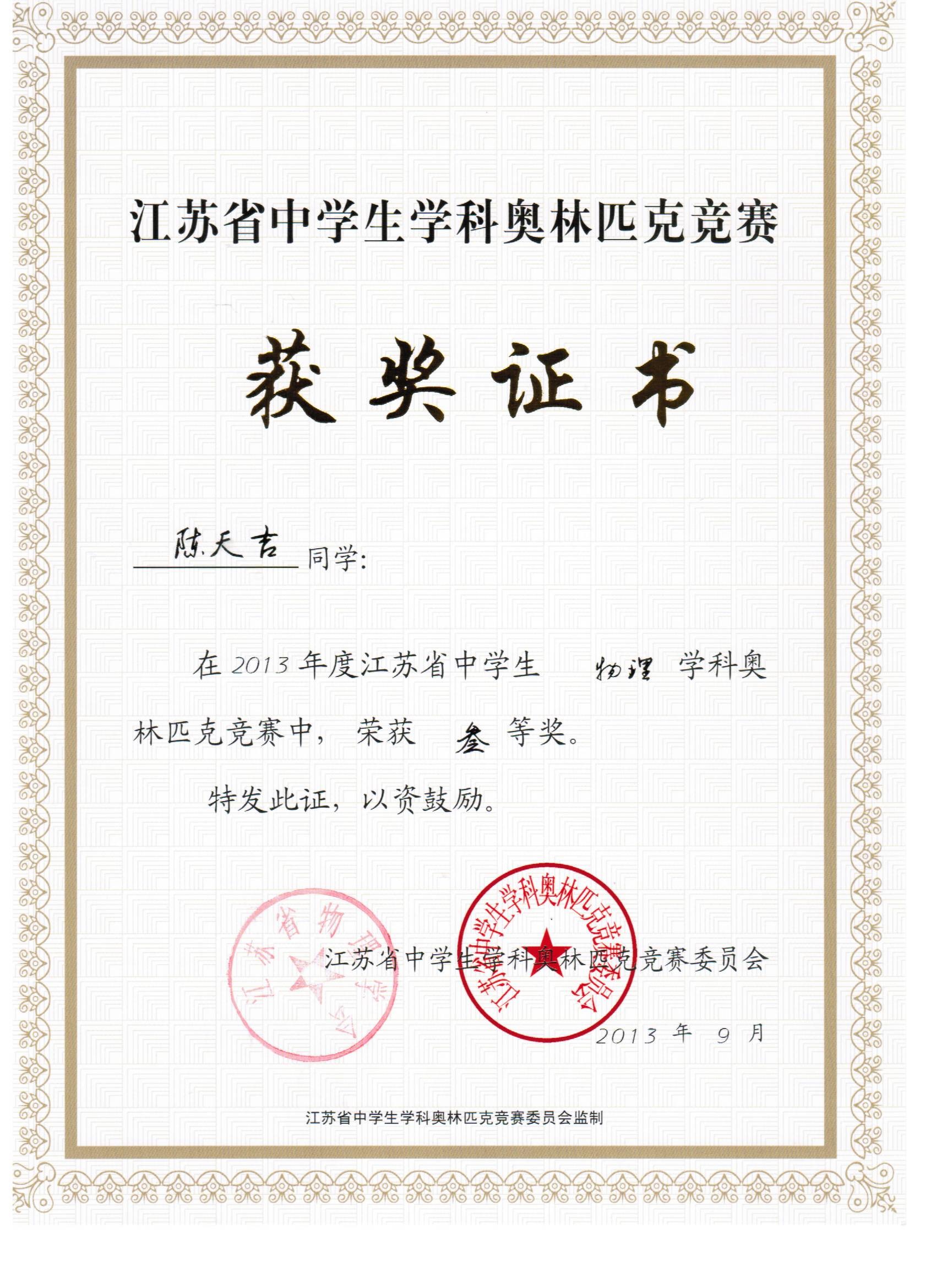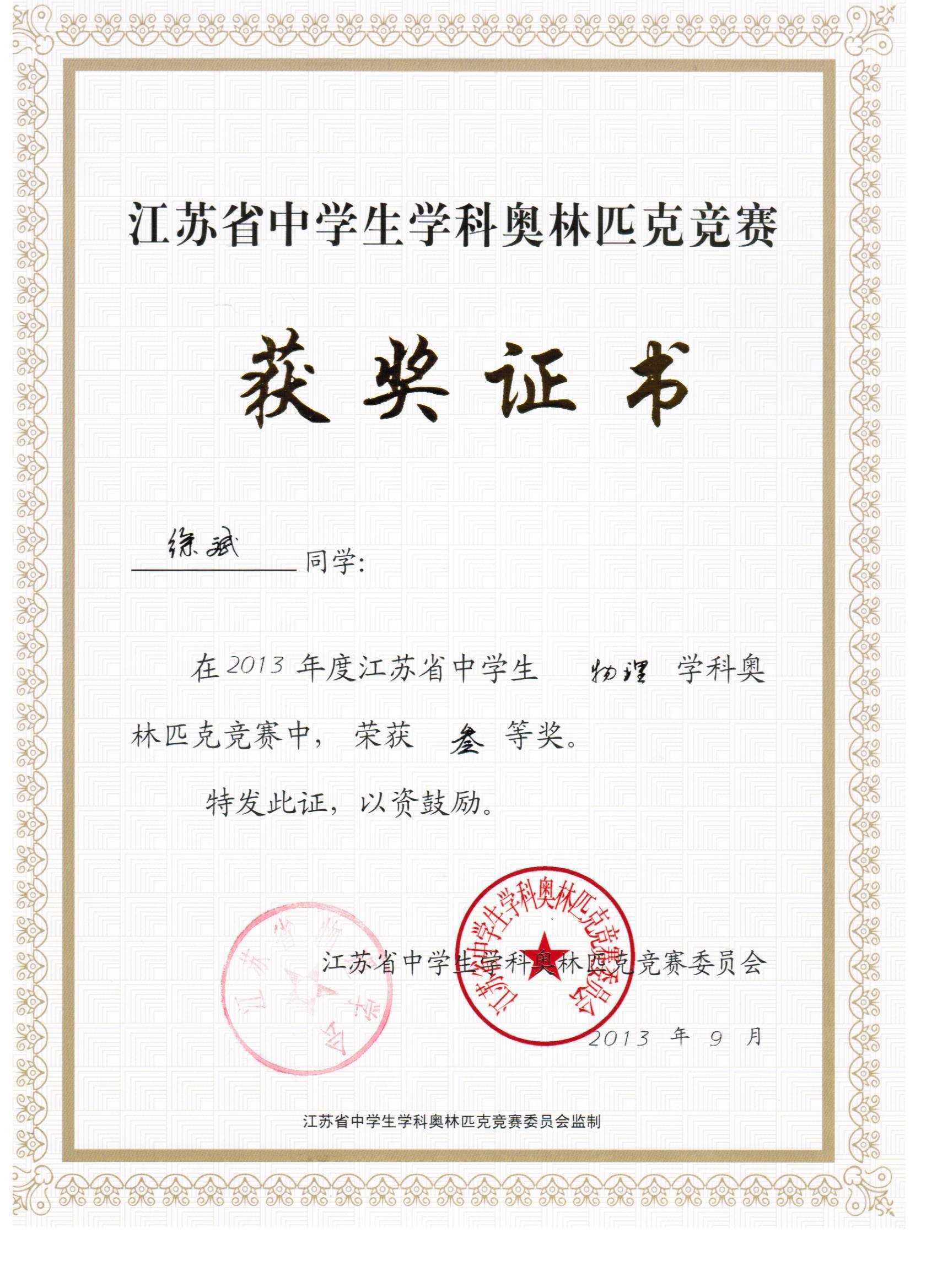我校有多位学生在2013年物理奥林匹克竞赛中获省级奖