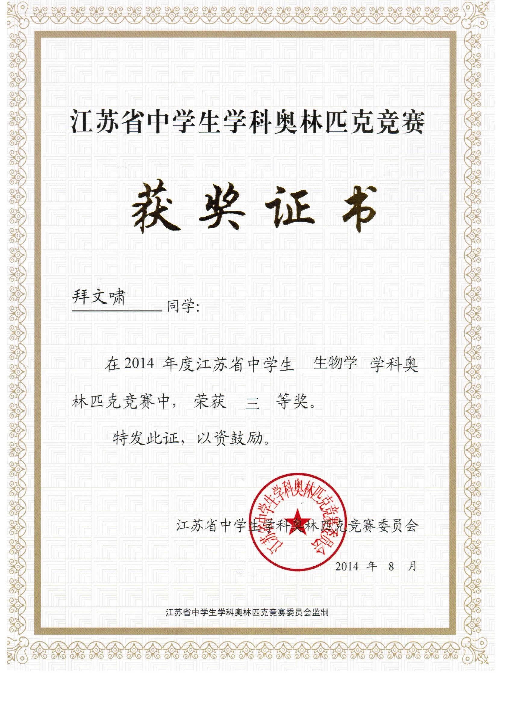 刘郇老师指导学生在2014年省生物奥林匹克竞赛中多人次获三等奖