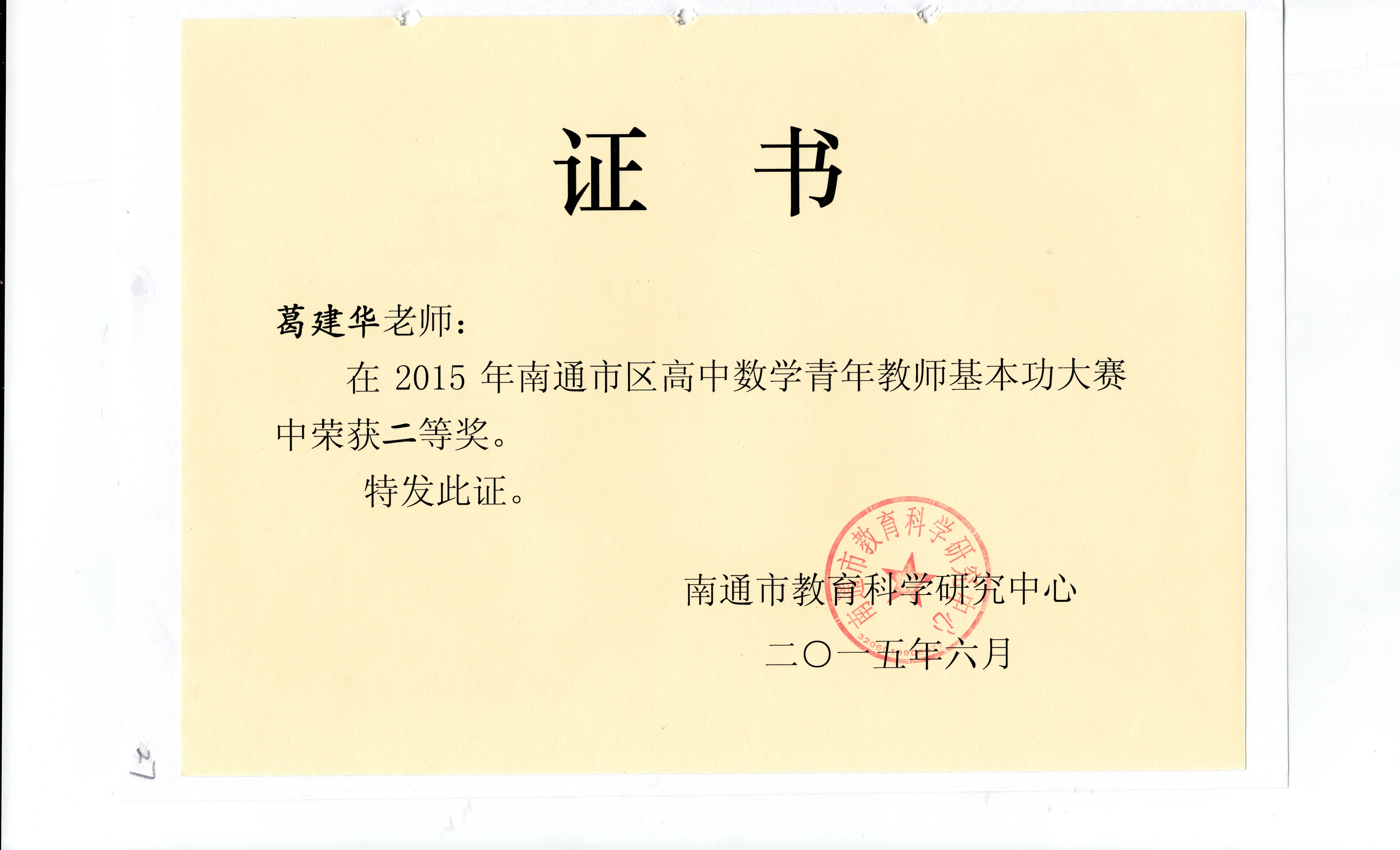 葛建华老师在南通市区高中数学青年教师基本功大赛中荣获二等奖