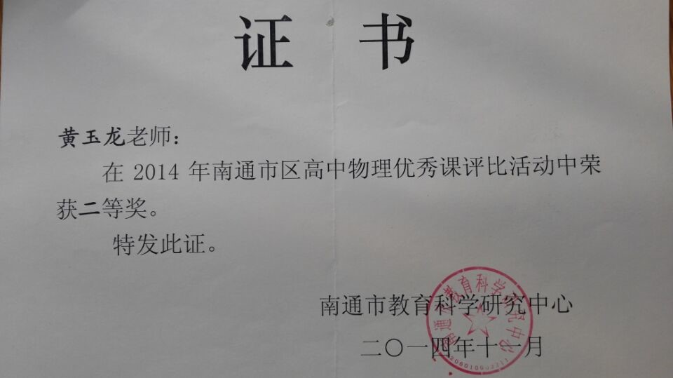 黄玉龙教师在南通市区高中物理优课评比中荣获二等奖