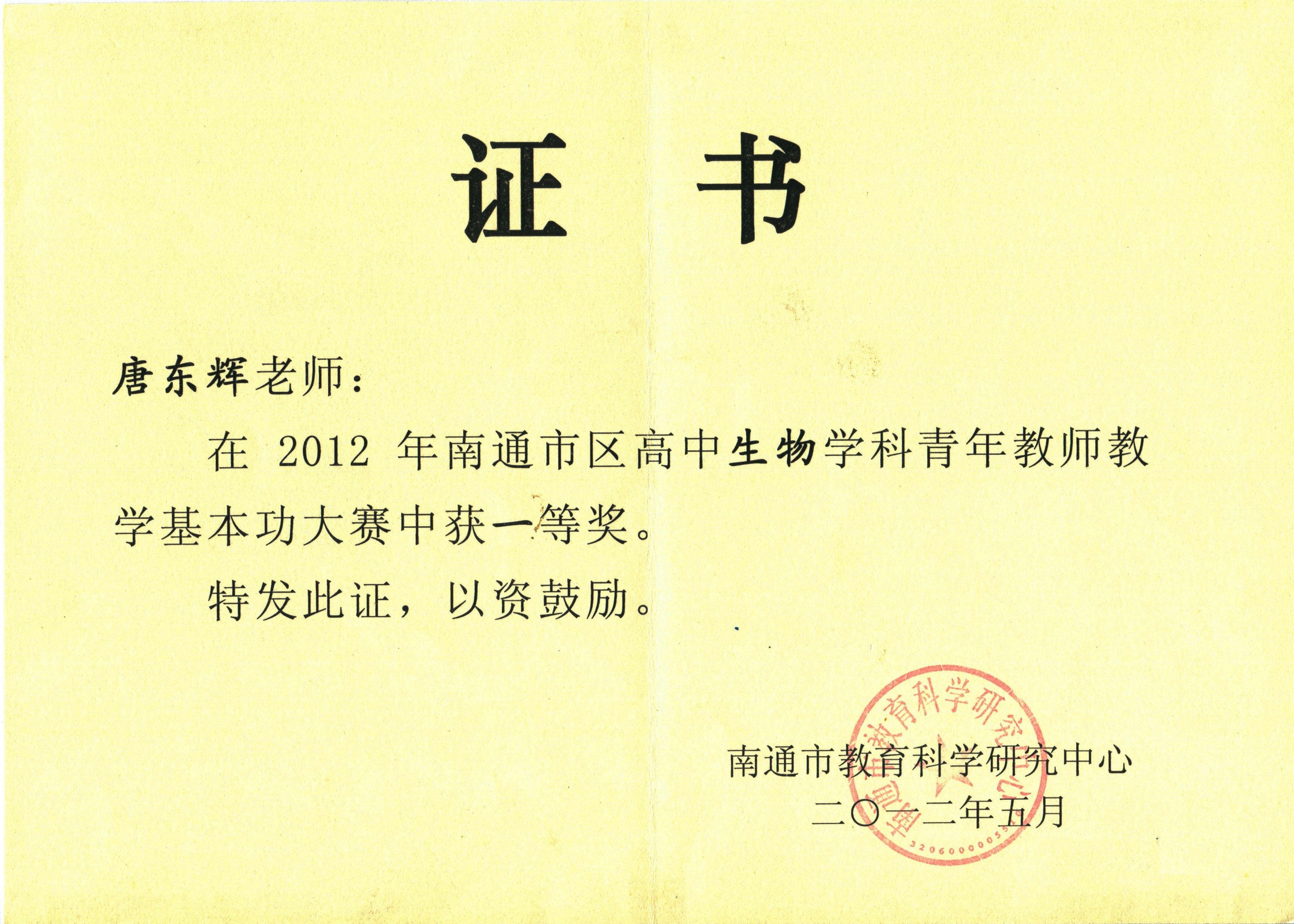 唐东辉教师在南通市区高中生物学科青年教师教学基本功大赛中荣获一等奖