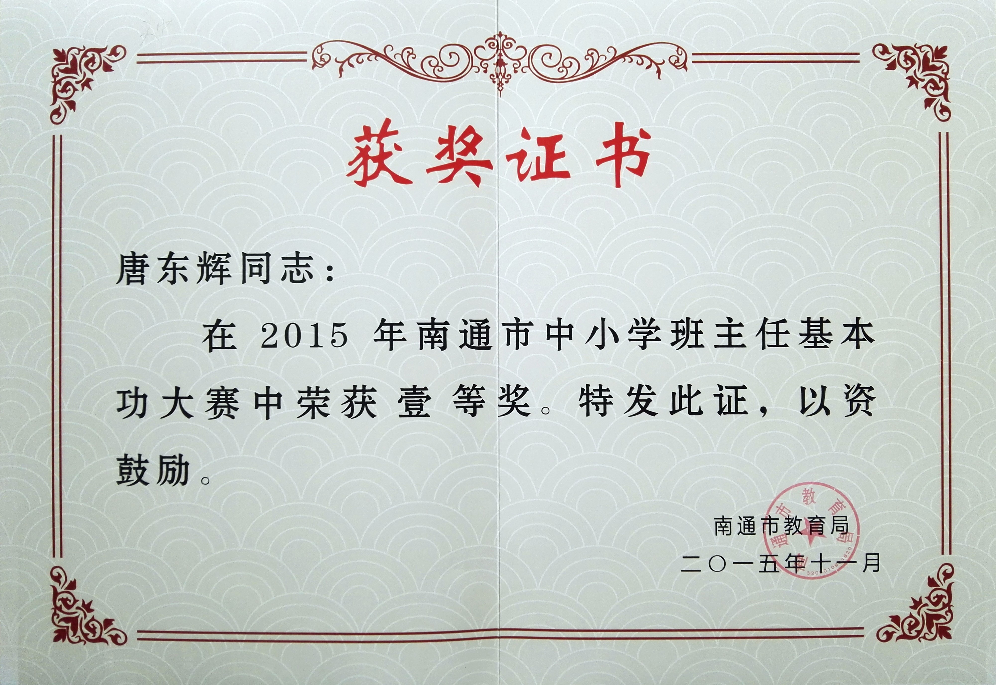 唐东辉教师在南通市中小学班主任基本功大赛中荣获一等奖