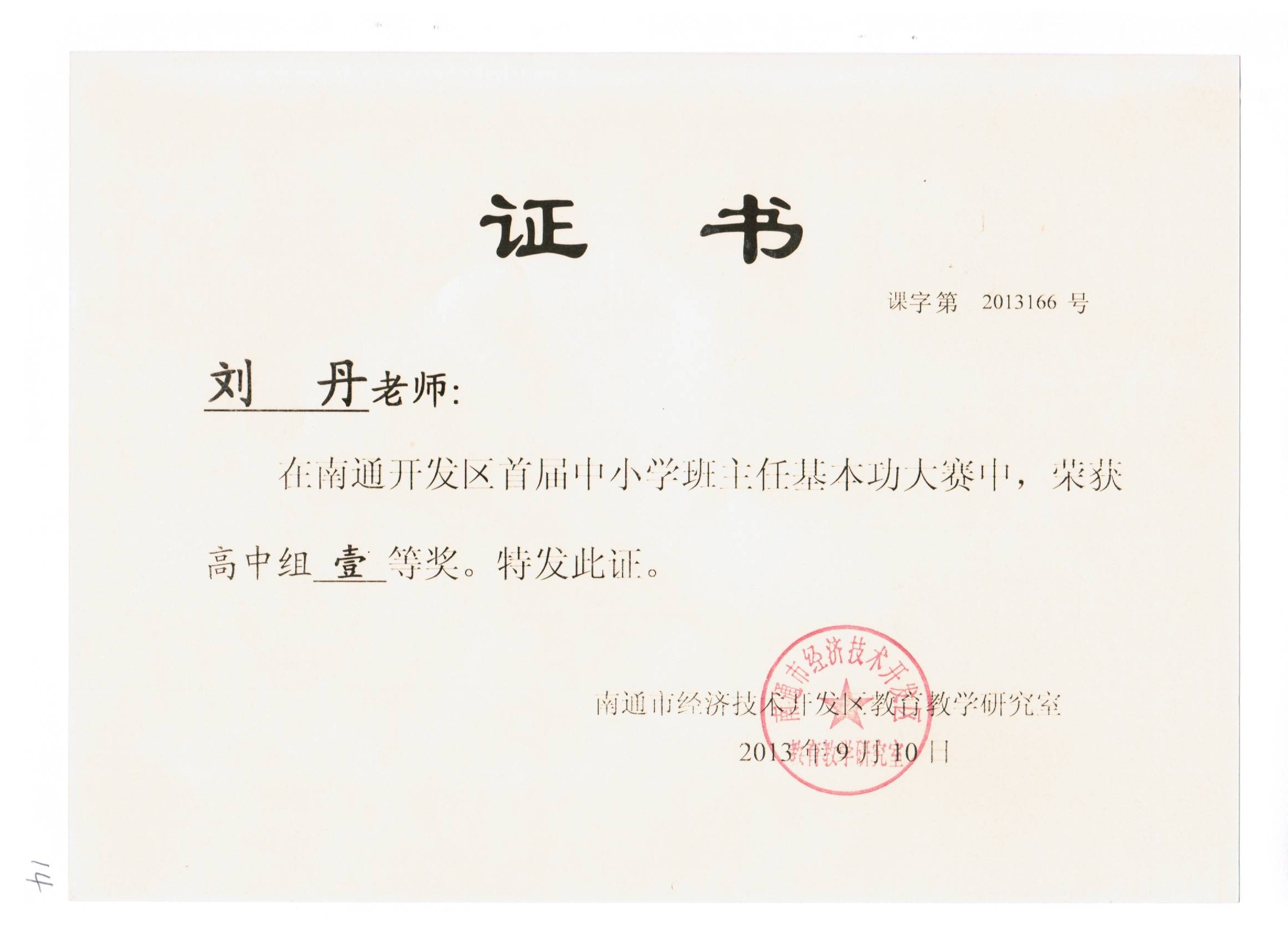 刘丹老师在南通市开发区首届中小学班主任基本功竞赛中荣获一等奖