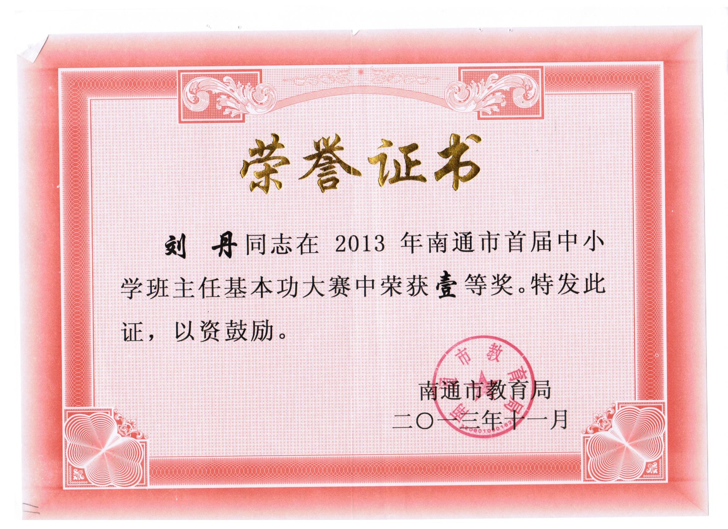 刘丹老师在南通市首届中小学班主任基本功竞赛中荣获一等奖