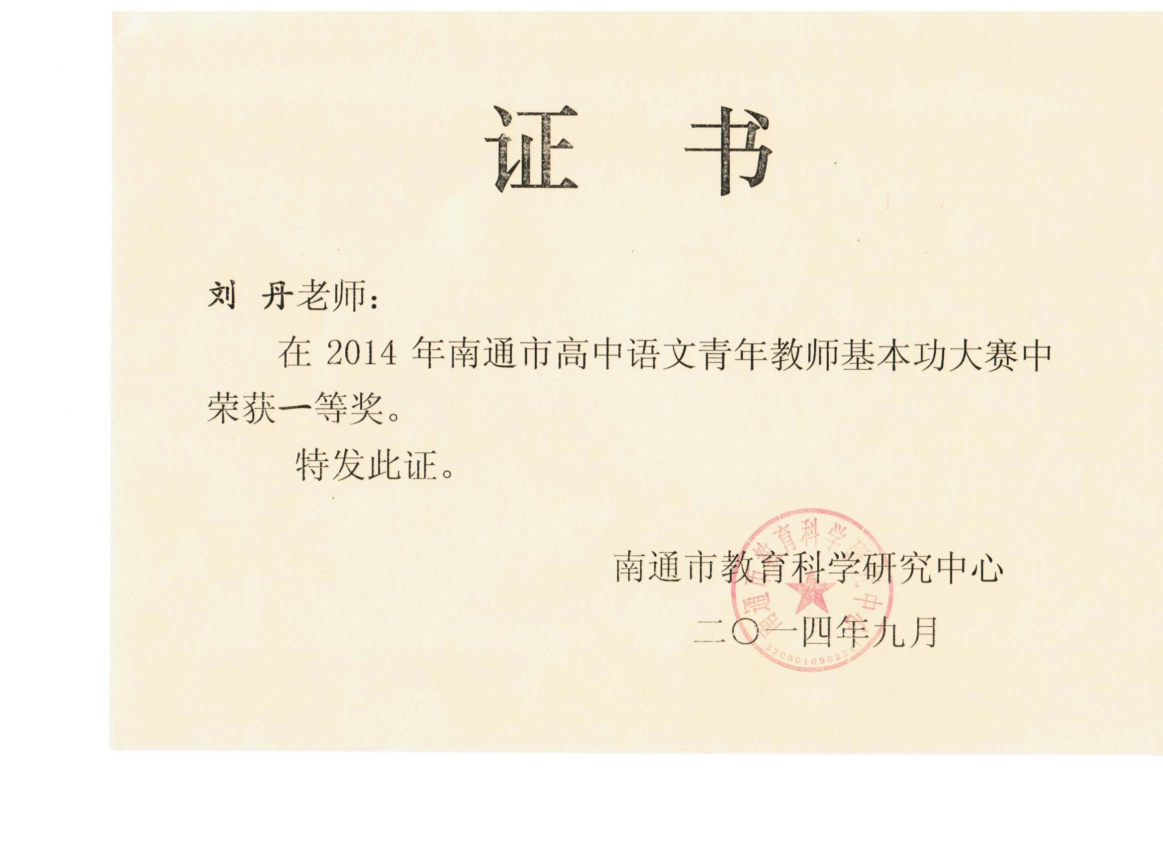 刘丹老师在南通市区高中语文青年教师基本功竞赛中荣获一等奖