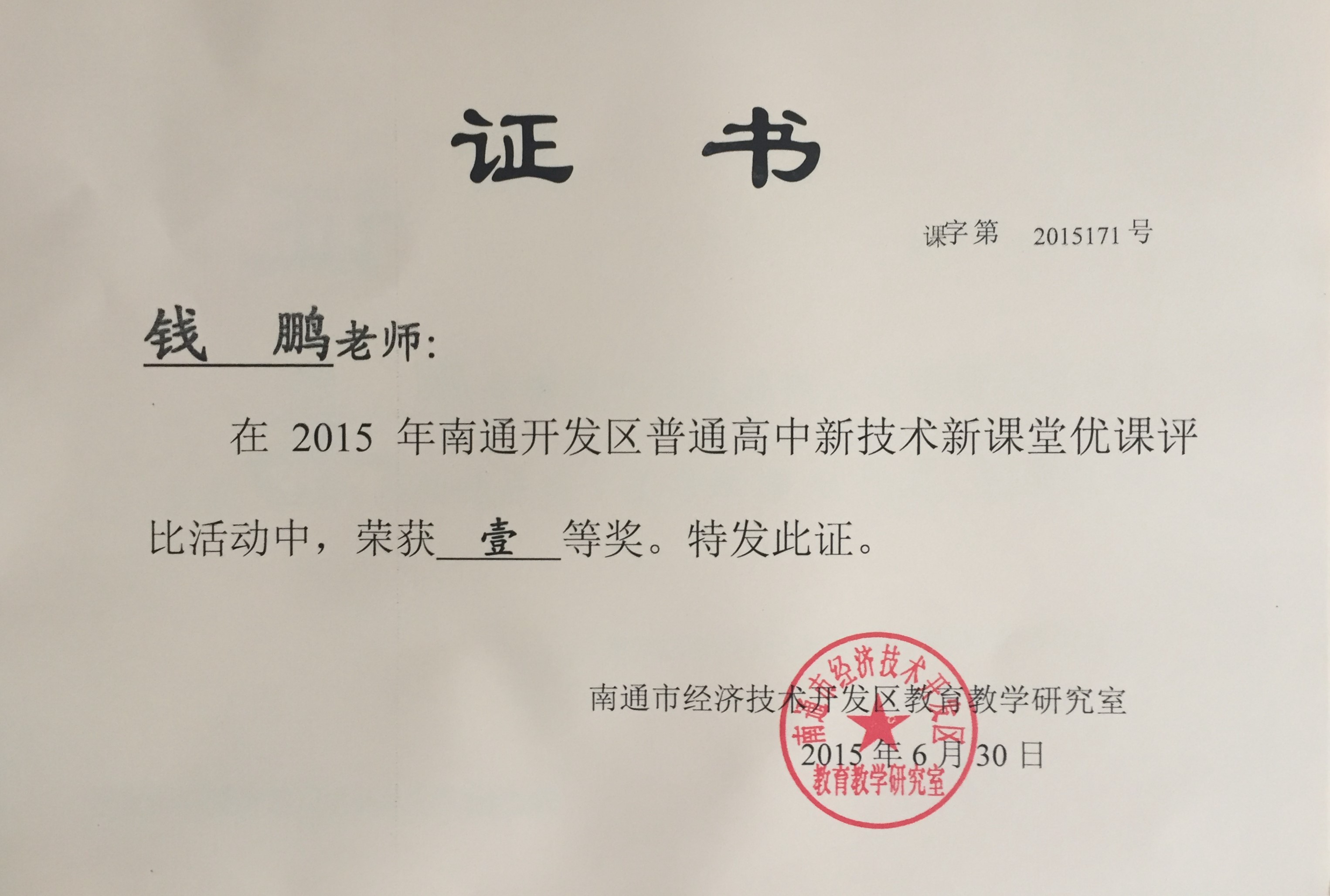 钱鹏老师在南通开发区普通高中新技术新课堂优课评比活动中荣获一等奖。