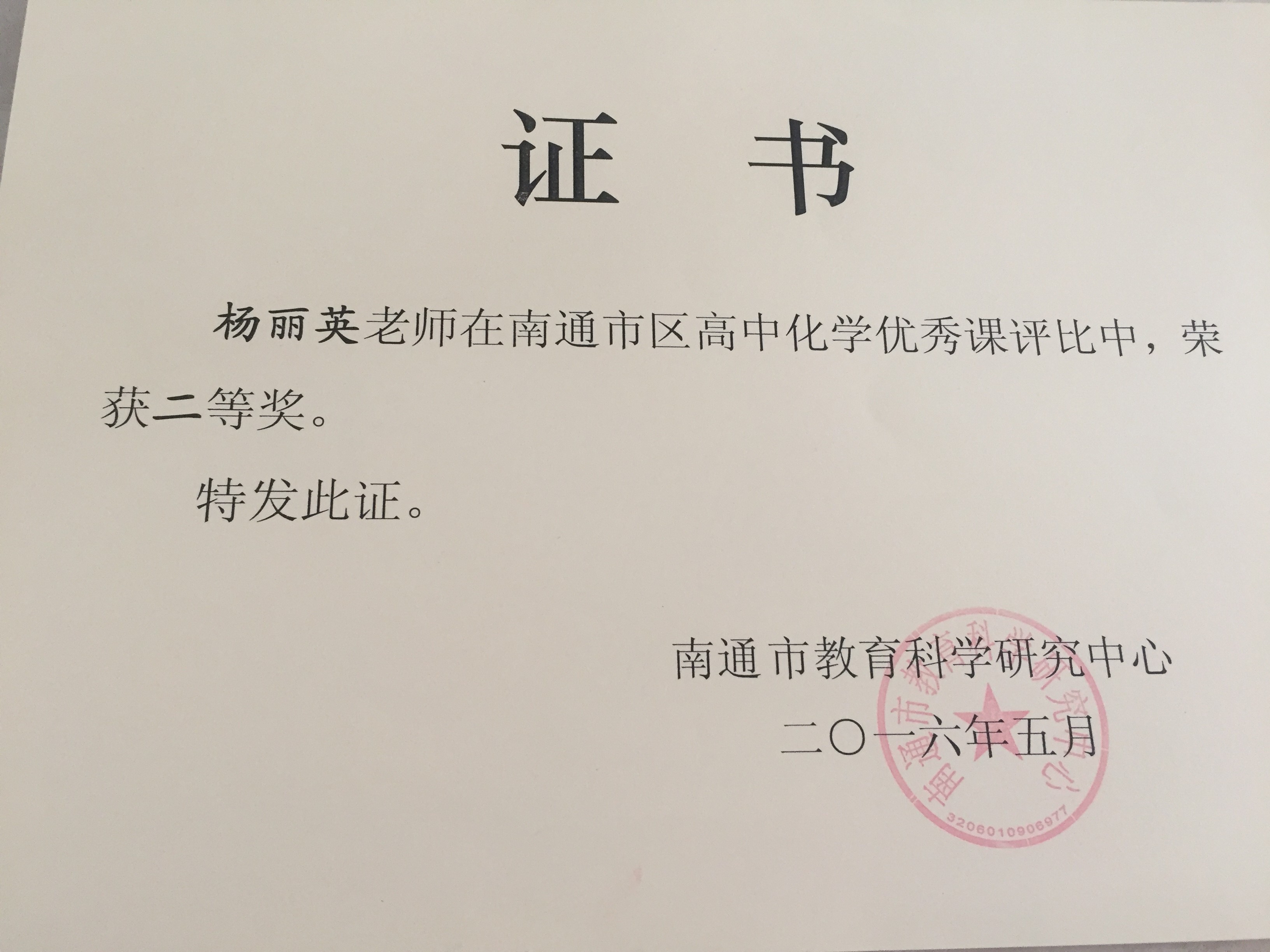 杨丽英在市区高中化学优课评比中荣获二等奖
