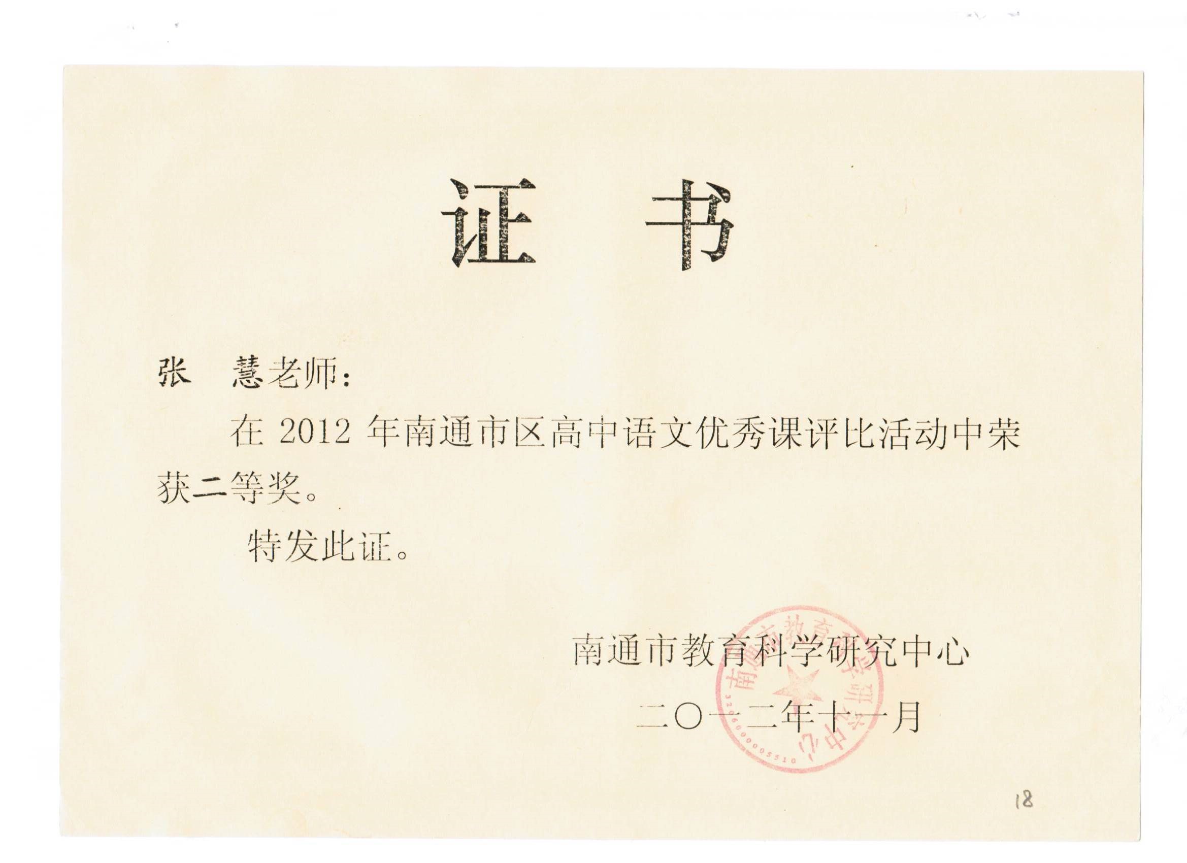 张慧老师在南通市区高中语文优秀课评比活动中获二等奖