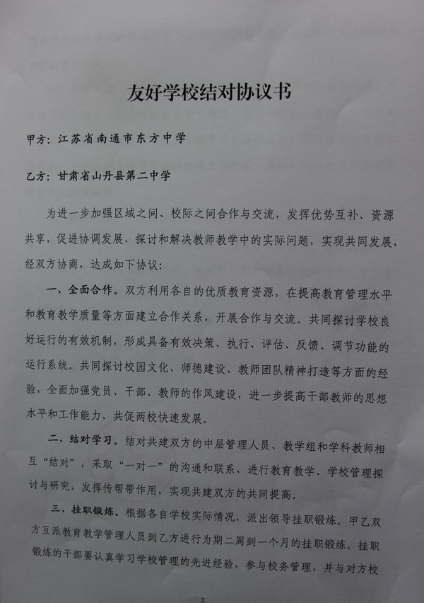 10月18日上午,南通市东方中学与甘肃省山丹县第二中学在乐英楼底楼会议室举行了“友好学校结对协议书”签字仪式。