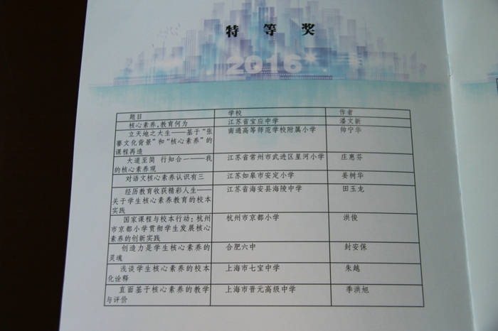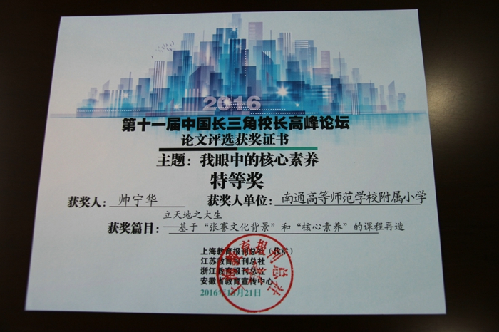 2016年10月21日-22日,第十一届中国长三角校长高峰论坛在上海市大同中学举行。今年论坛主题聚焦“核心素养——校长的思考与实践”, 来自江、浙、沪、皖等地250多名中小学校长参与讨论交流。我校帅宁华校长撰写的《立天地之大生——基于“张謇文化背景”和“核心素养”的课程再造》一文荣获特等奖。