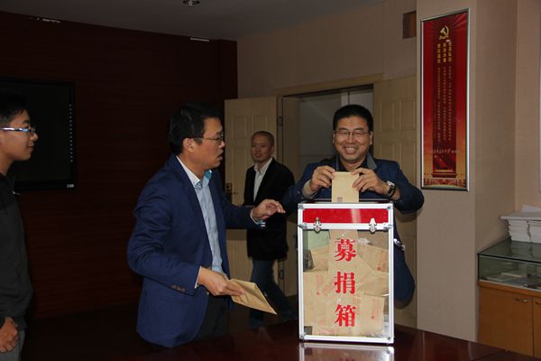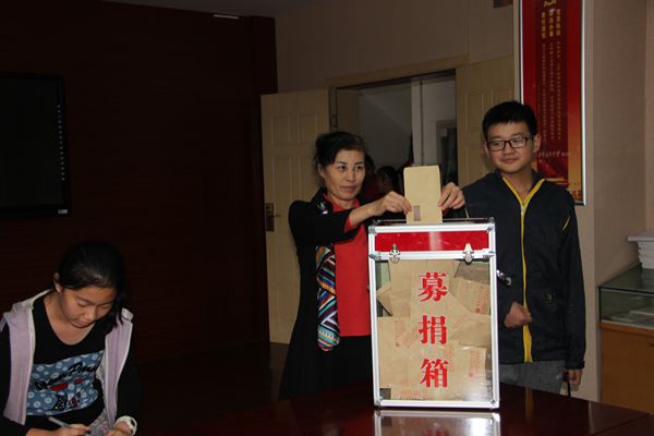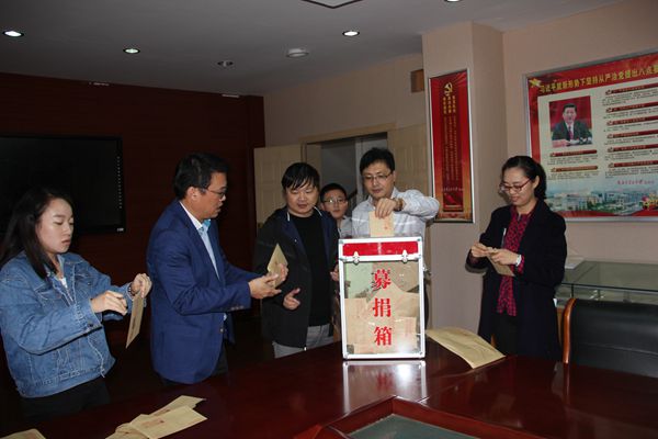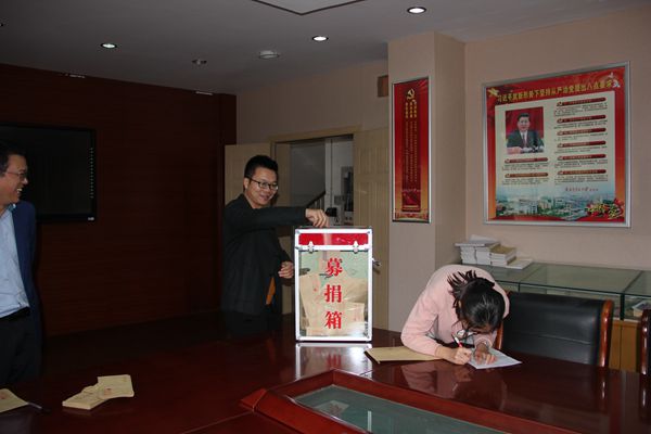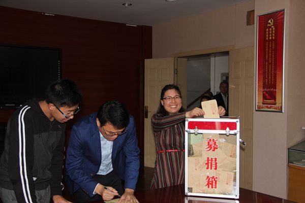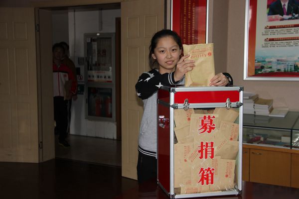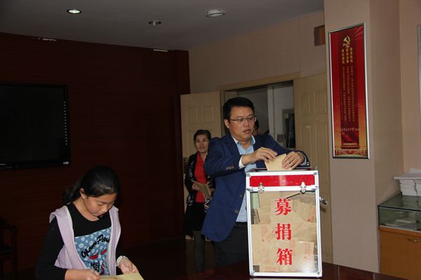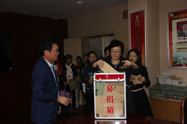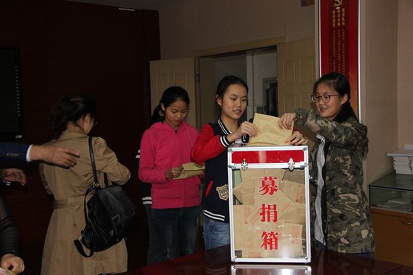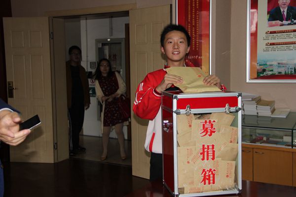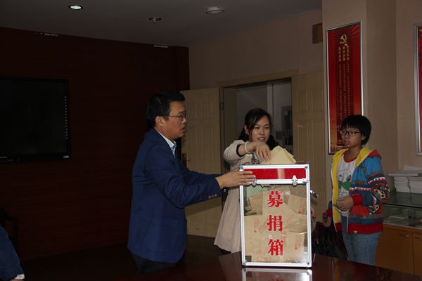 由于天气下雨的原因,捐助活动改在乐英楼底楼会议室进行。捐款活动开始后,两百多名教职工排队来到捐款箱前,献出了自己的一份份爱心。学生也积极踊跃捐出自己一天的零花钱,全校54个班级学生代表以班为单位依次将同学们的善款投入捐款箱中。