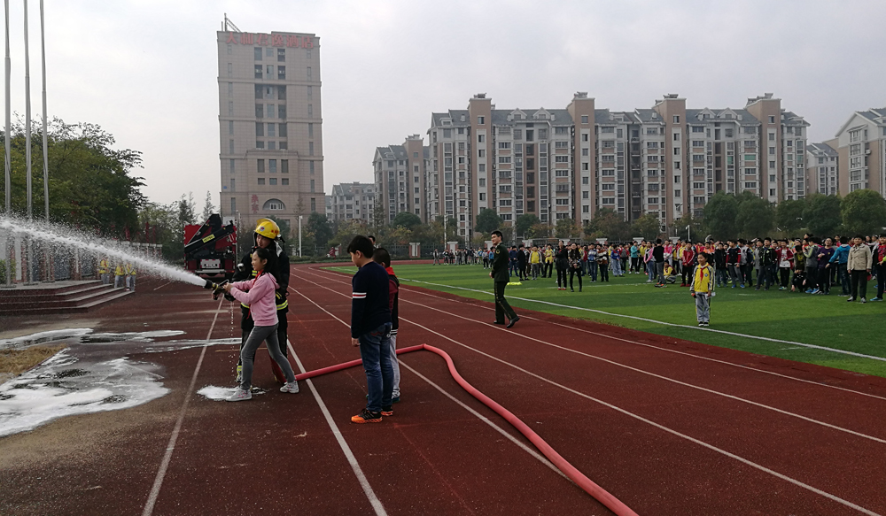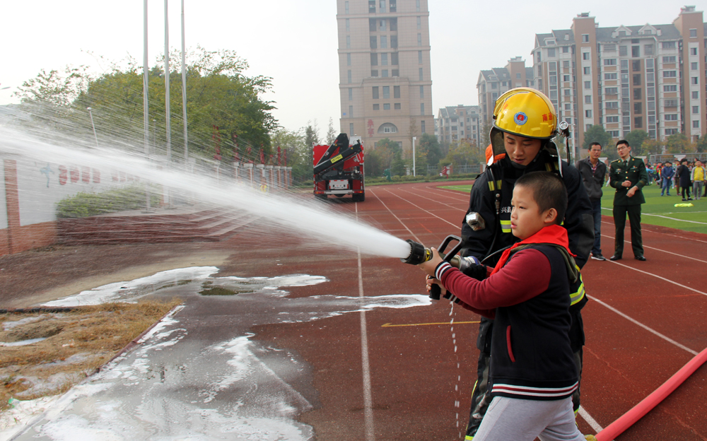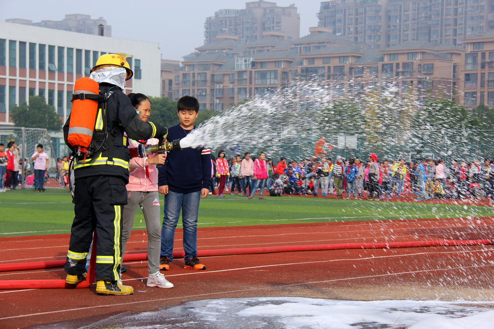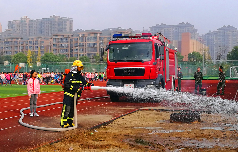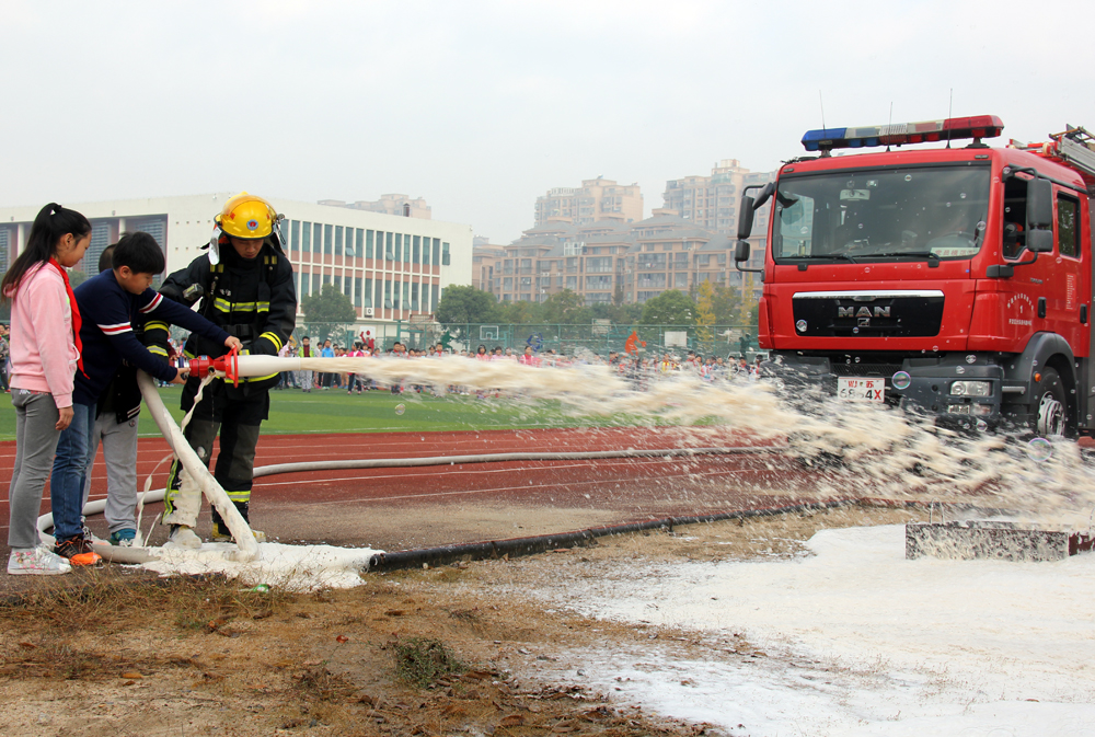 最激动人心的是消防队员现场进行了泡沫灭火、高压水枪灭火、快速穿消防服等演示。一些幸运的同学还在消防员叔叔的指导下实地体验了灭火的要领。演练结束后,消防官兵在消防车前向同学们介绍了一些常见的消防工具,详细讲解了这些工具的功能和作用。