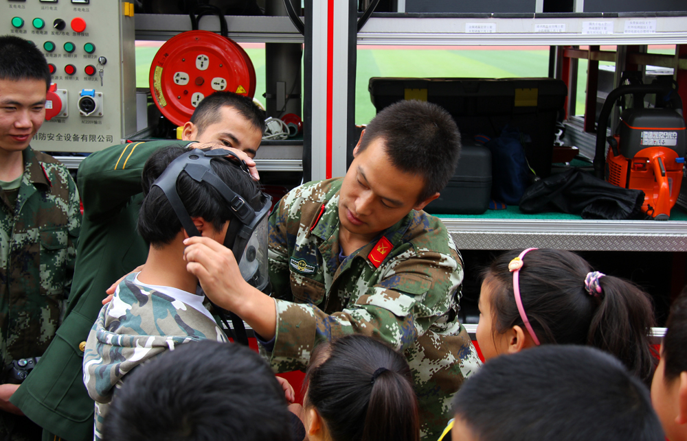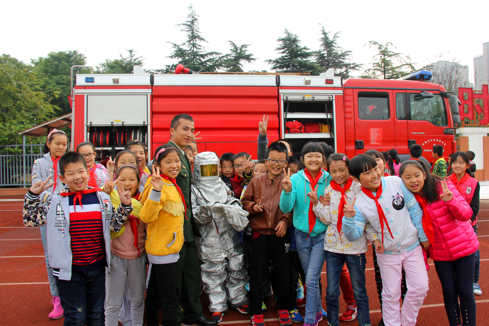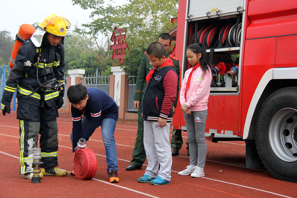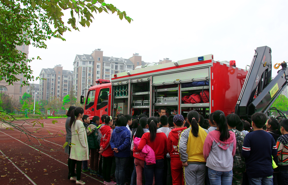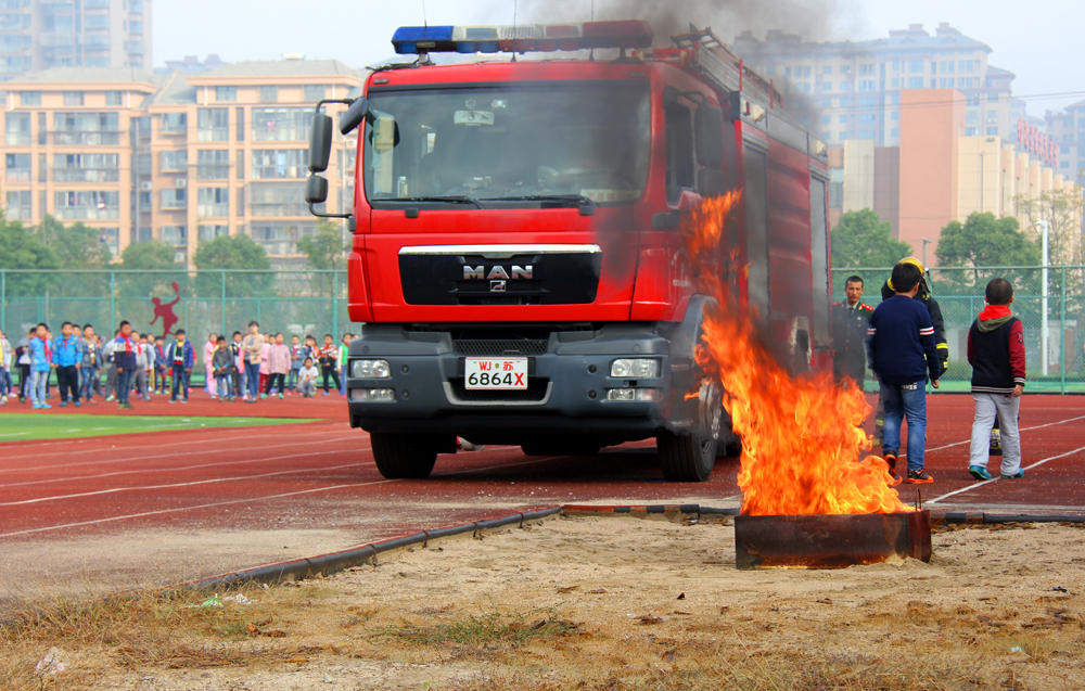 最激动人心的是消防队员现场进行了泡沫灭火、高压水枪灭火、快速穿消防服等演示。一些幸运的同学还在消防员叔叔的指导下实地体验了灭火的要领。演练结束后,消防官兵在消防车前向同学们介绍了一些常见的消防工具,详细讲解了这些工具的功能和作用。
