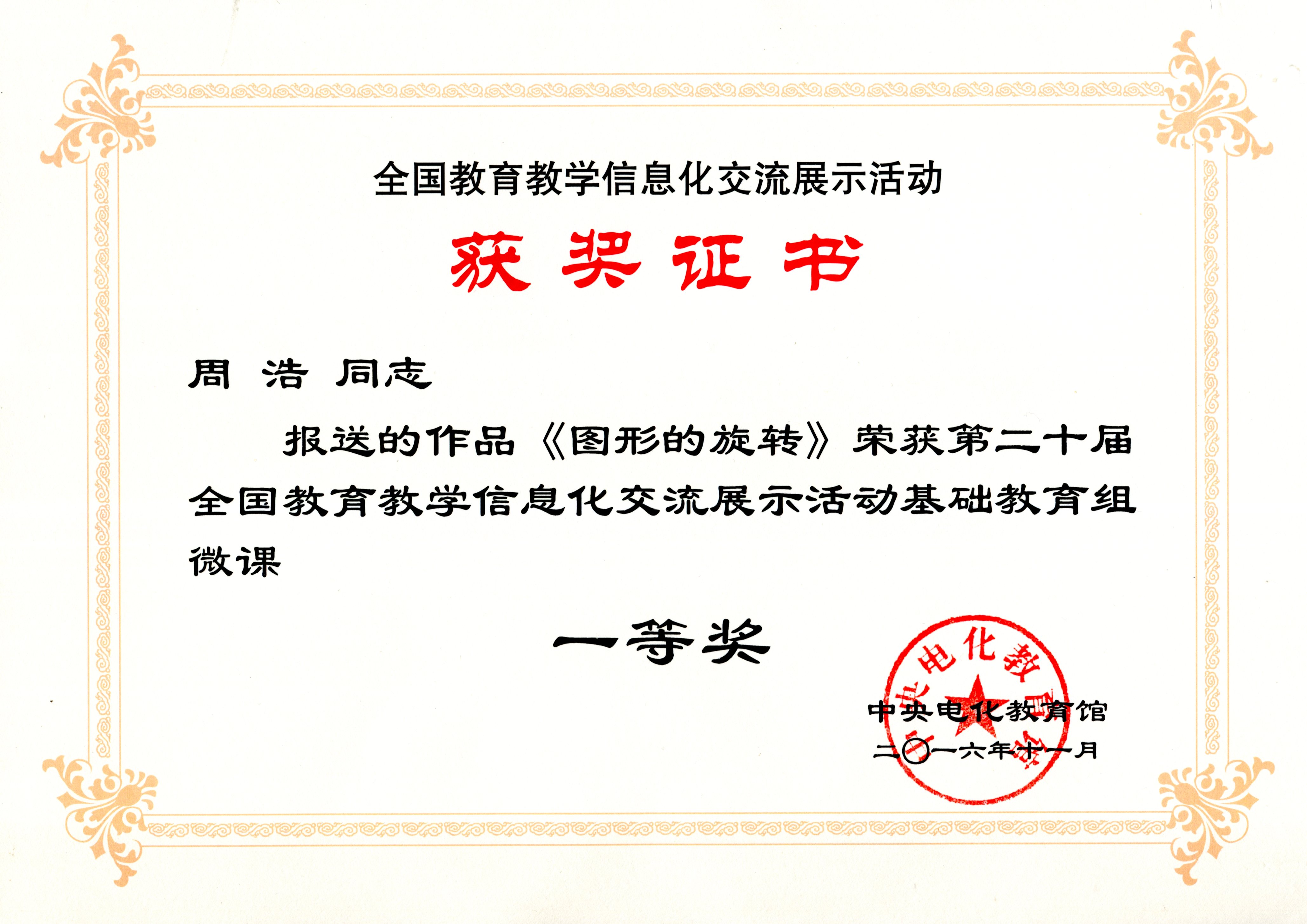 园区实小周浩老师荣获全国教育教学信息化交流展示活动一等奖