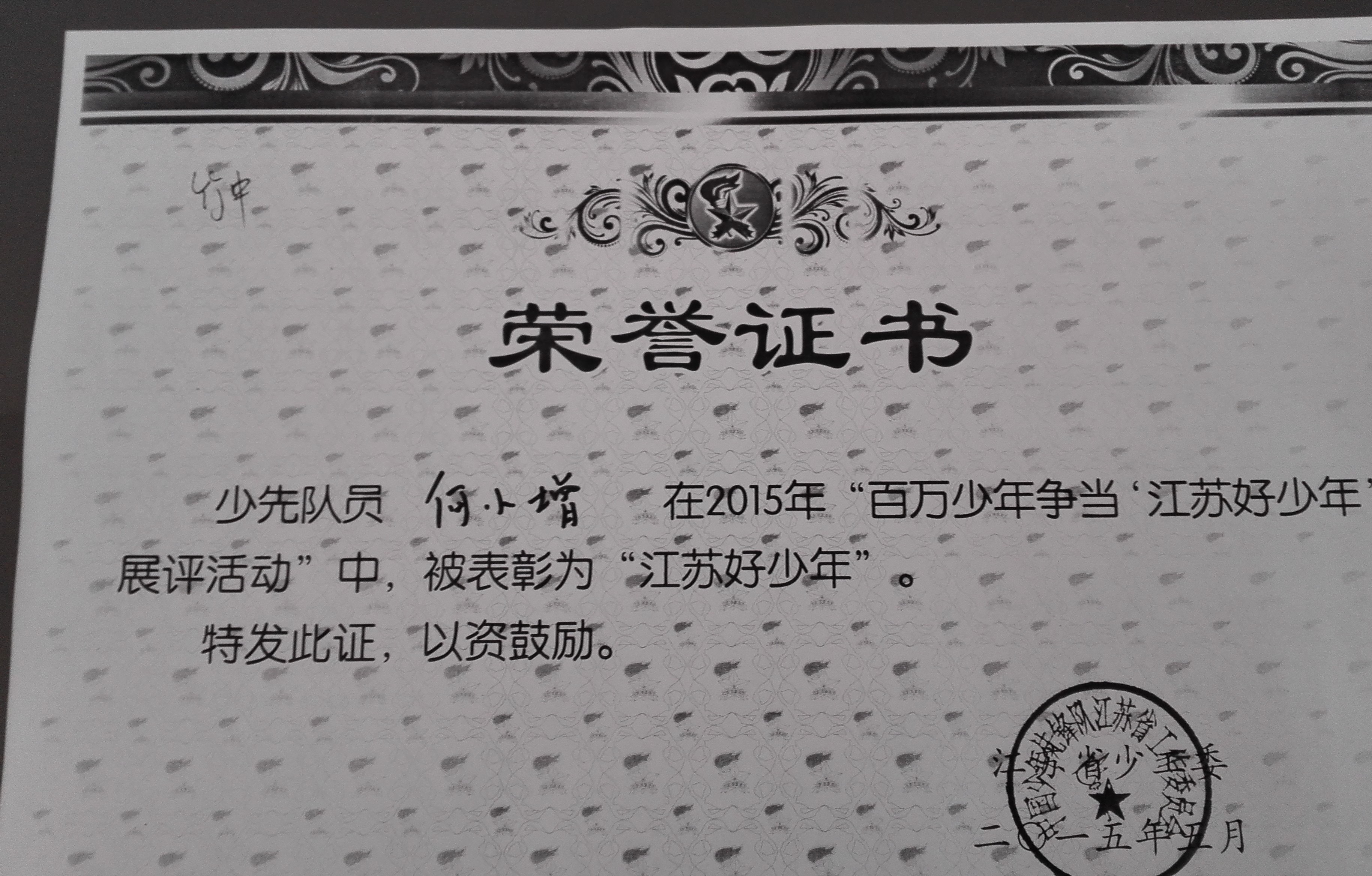 孙丽雯同学被评为“南通开发区优秀少先队员”