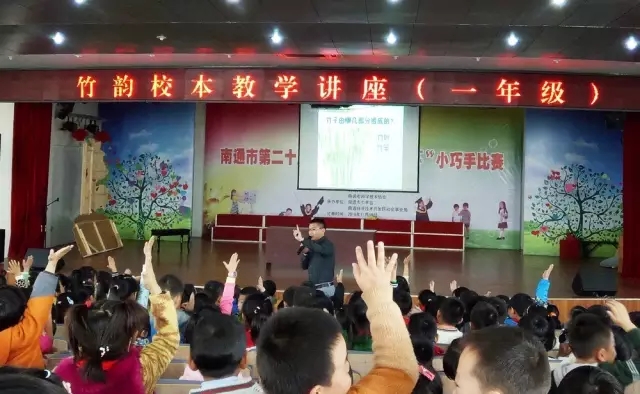 11月15日中午,首场竹韵校本课程讲座在学校报告厅开讲啦!戴亚兵校长带领一年级400多名学生认识竹子的组成部分,了解竹子的生长过程,诵读有关竹子的儿歌、课文和自编的《竹之歌》,孩子们逐步感受到了竹子奋力向上、团结一心的精神,受到了“团结就是力量大”品质濡染。